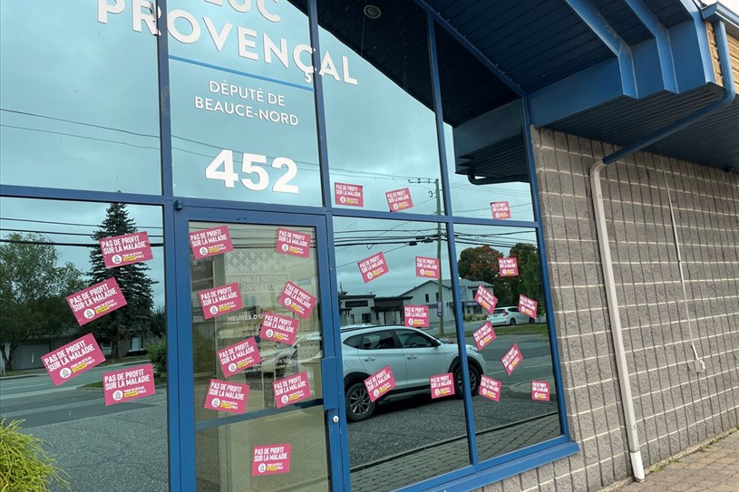 Des militants de la Confédération des syndicats nationaux (CSN) ont placardé la façade du bureau du député de Beauce-Nord, Luc Provençal, d'autocollants de la campagne nationale que mène le groupement contre le privé en santé.