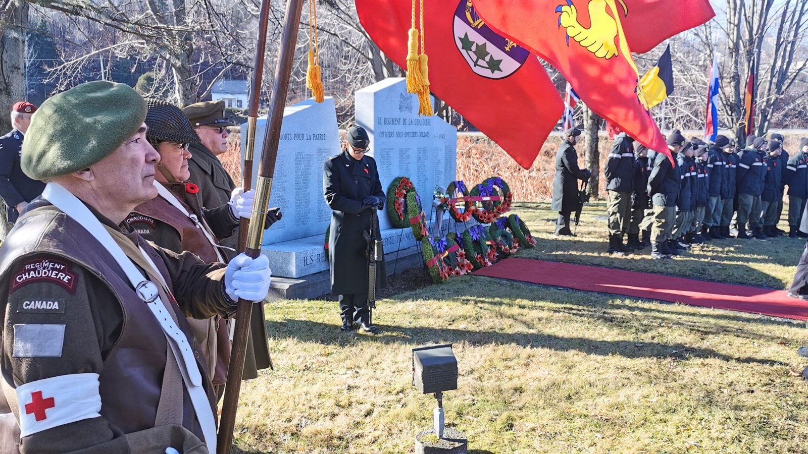 Plusieurs dignitaires ont déposé des couronnes au pied du monument qui comporte les 254 noms de soldats du Régiment de la Chaudière, disparus durant la Seconde Guerre mondiale. Neuf de ces noms ont d'ailleurs été ajoutés cette année.