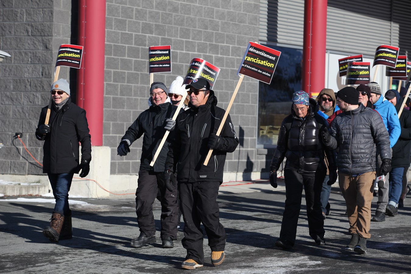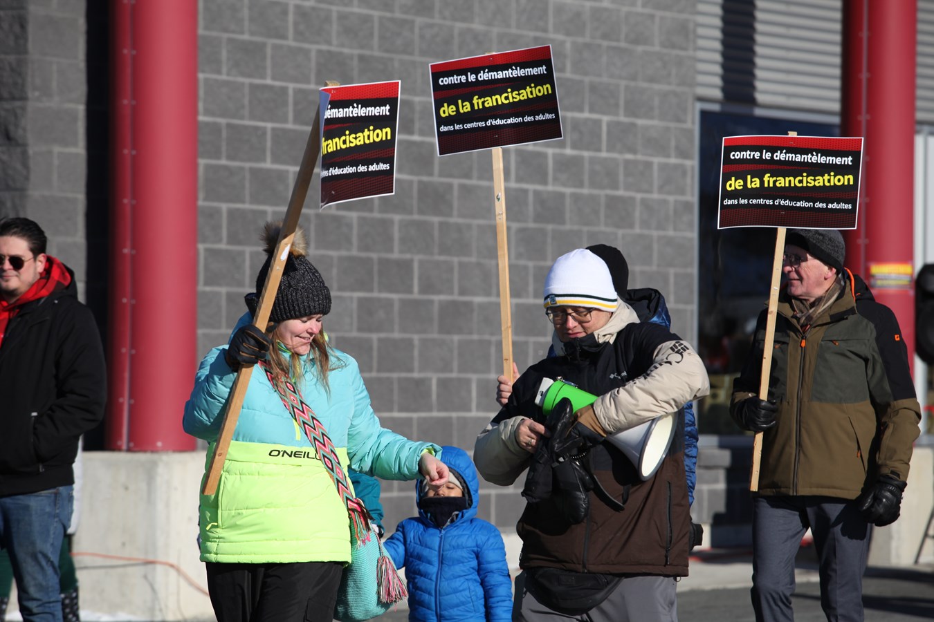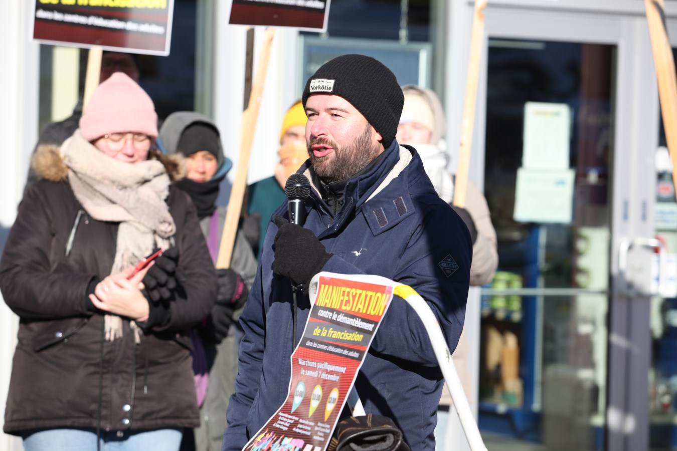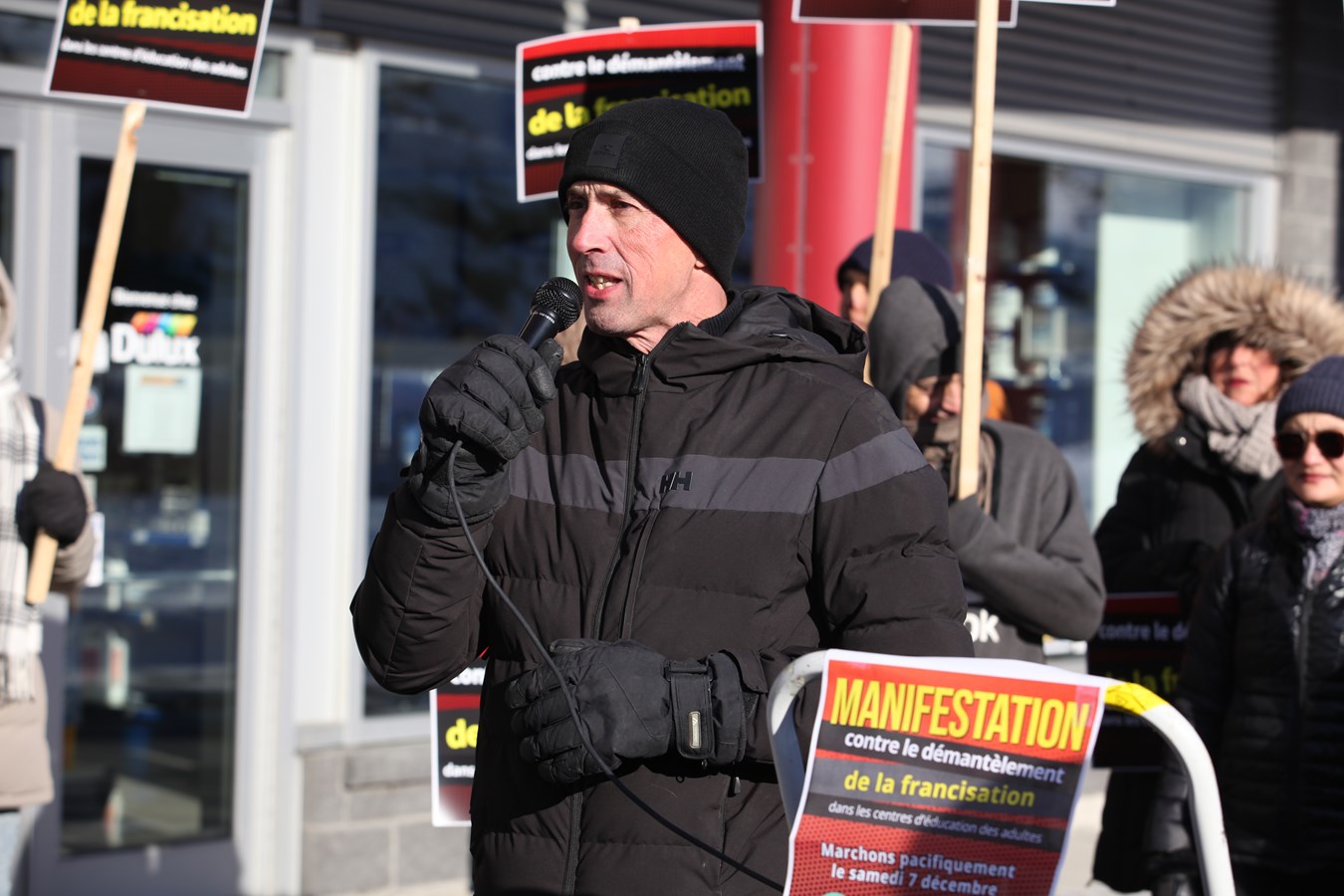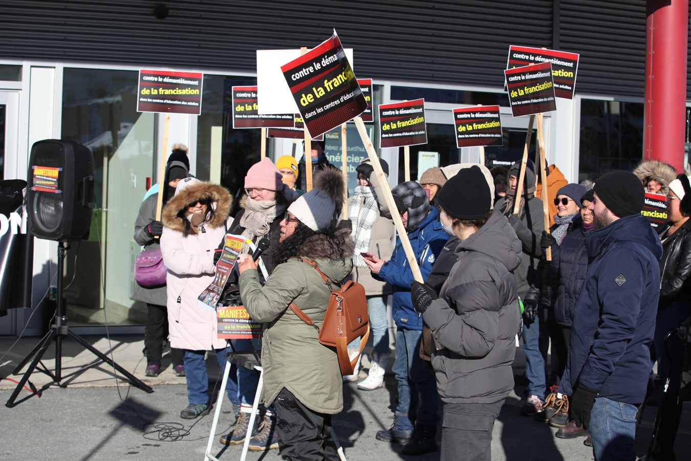 « Je vous remercie, vous les citoyens de venir dénoncer ce qu'il se passe et de manifester pour le maintien de la francisation dans nos centres d'éducation des adultes. J'aimerais saluer les personnes immigrantes qui sont parmi nous. On sait que vous avez fait d'énormes sacrifices pour venir ici travailler dans notre région », a lancé Éric Nadeau, enseignant en francisation.