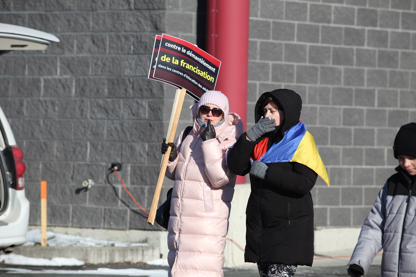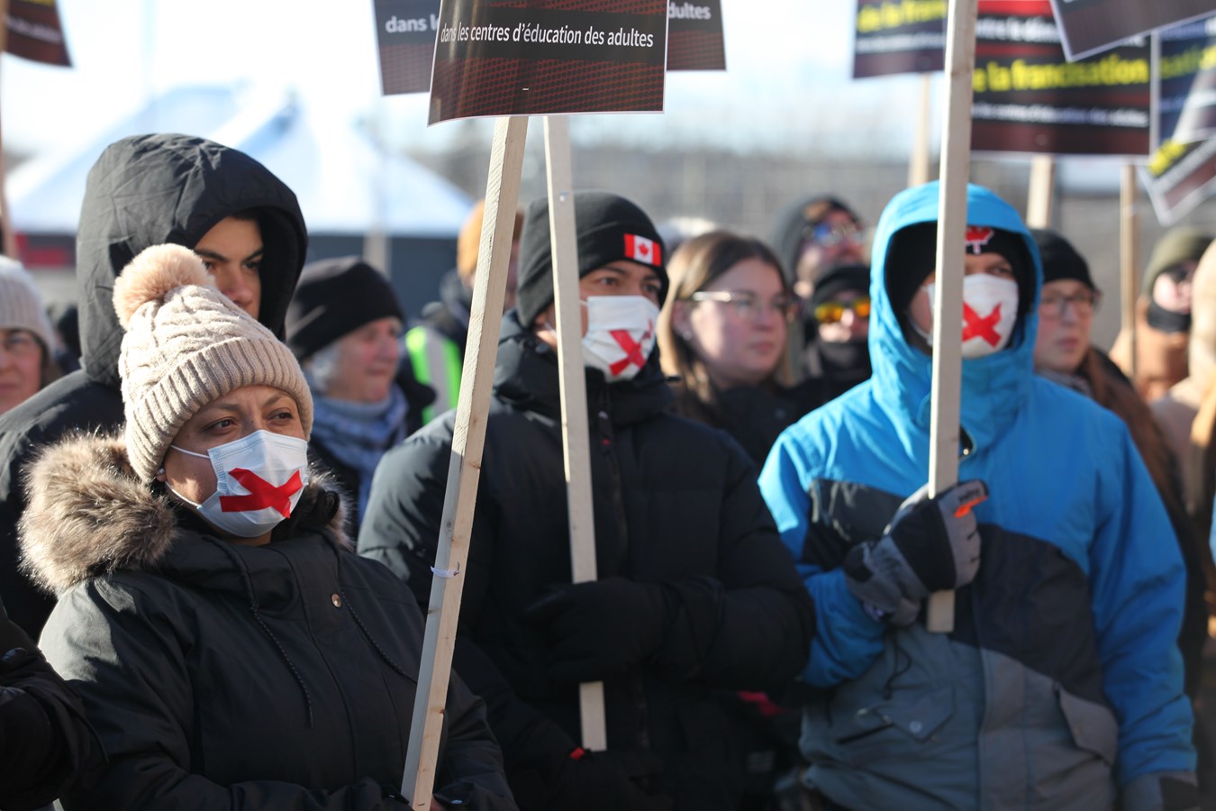 Dès 11h, le Centre Sportif Lacroix-Dutil a vu affluer des manifestants de tous âges, certains portant les masques respiratoires marqués d’un X, d’autres brandissant des pancartes avec des slogans tels que « Pas de francisation = Pas d'intégration » et « Contre le démantèlement de la francisation ».