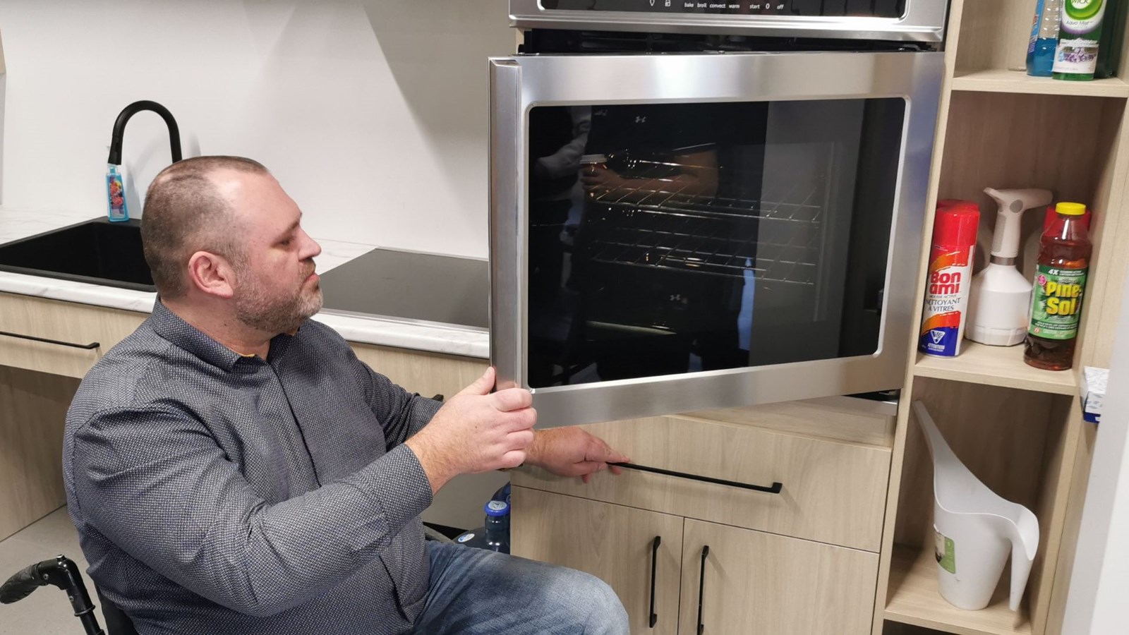 La coin-cuisine, qui sert à donner des cours de formation culinaire, est bien sûr conçu pour être accessible aux personnes en fauteuil roulant, avec des comptoirs et armoires de cuisine plus bas. C'est le cas aussi du mobilier, comme les tables de travail, qui sont ajustables.