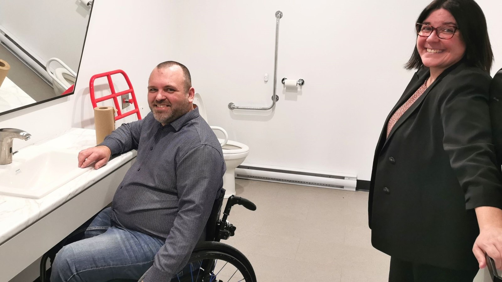 En résumé, les travaux ont consisté à ajouter une rampe d’accès extérieur, à modifier la largeur des portes extérieures et intérieures, à installer des boutons-poussoir d'ouverture, des barres d’appui et un miroir inclinable.