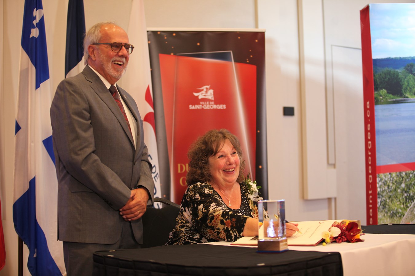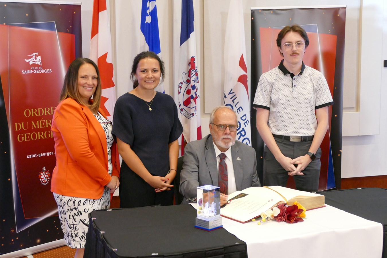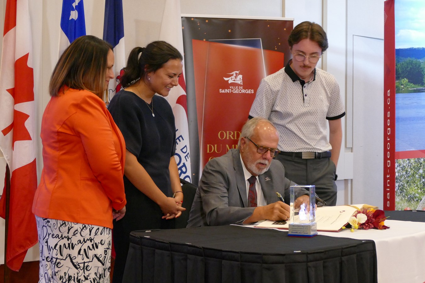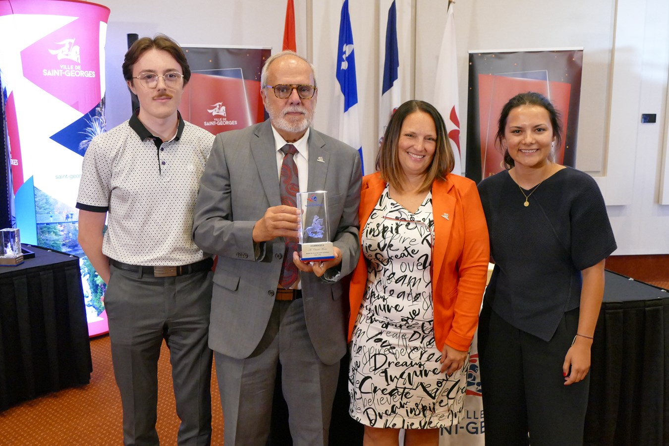 « Les témoignages que nous avons entendus ce soir sont extraordinaires. Si la ville de Saint-Georges se développe, est aussi belle et accueillante, c’est grâce à vous cinq. Si vous n’étiez pas là, il faudrait vous inventer, c’est aussi simple que ça. Ça ne paraît pas parfois, car vous savez ce que vous faites, mais l’impact que vous avez sur les citoyens ici est incroyable », a insisté Claude Morin après l’écoute des différents hommages.