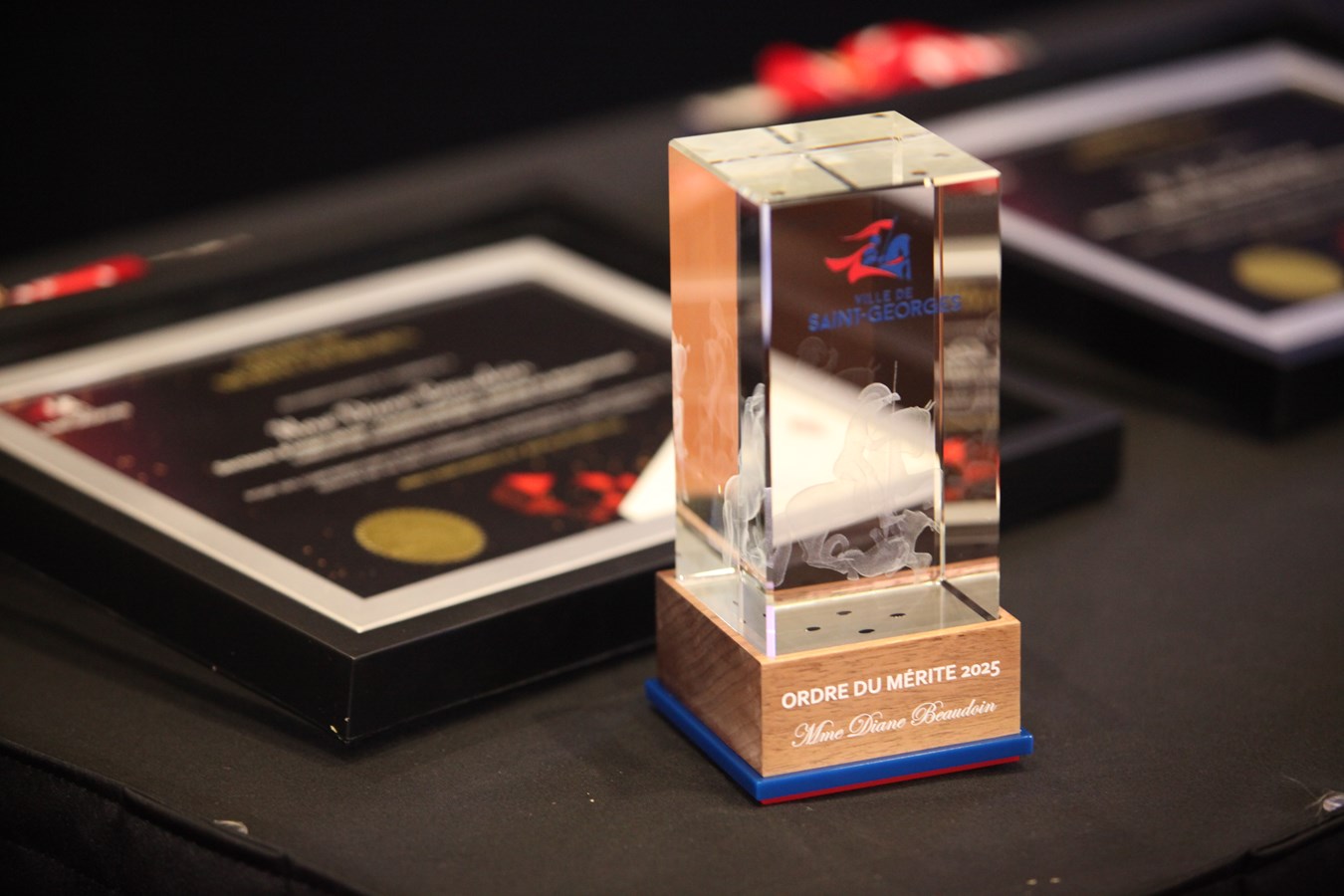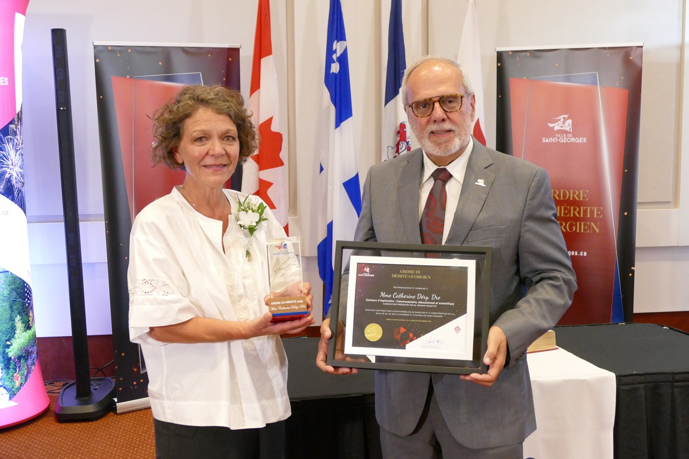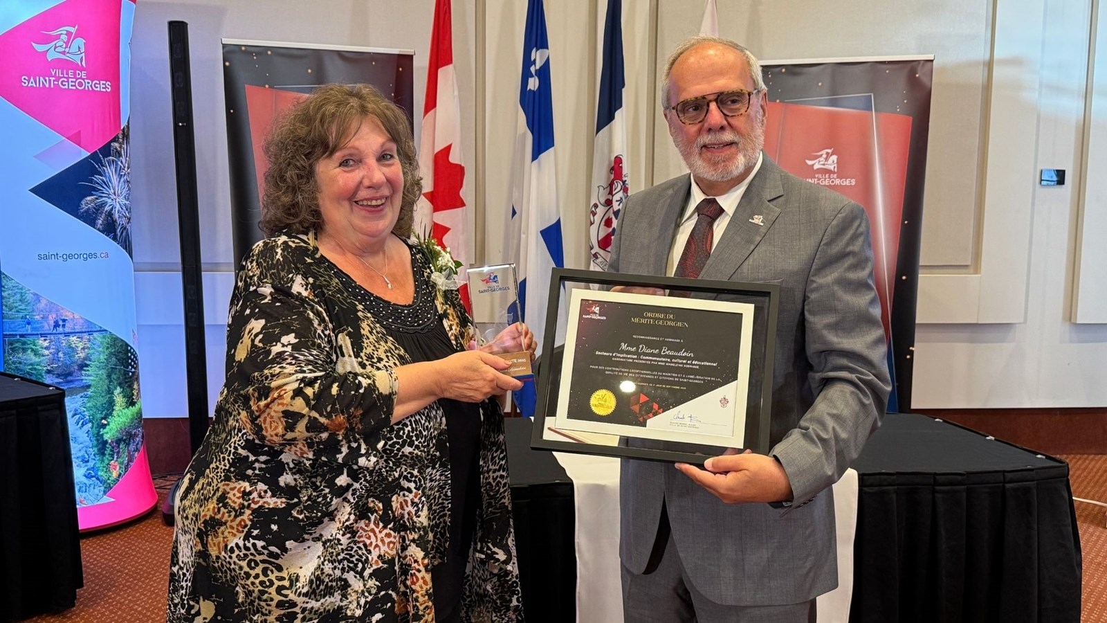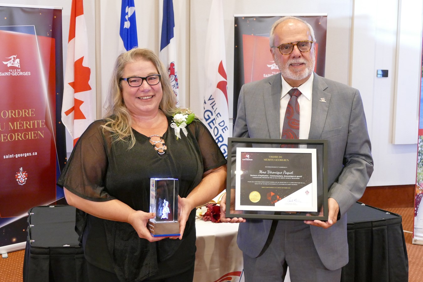 Cinq citoyens aux parcours variés, mais tous remarquables, ont été honorés pour leur engagement citoyen. Diane Beaudoin, Michel Jacques, Véronique Paquet, Alain Tanguay et la Dre Catherine Déry ont ainsi reçu un George de cristal, une épinglette de l’ordre, un certificat honorifique, deux places de concert ainsi qu’une copie du grand volume des Chroniques de Saint-Georges.