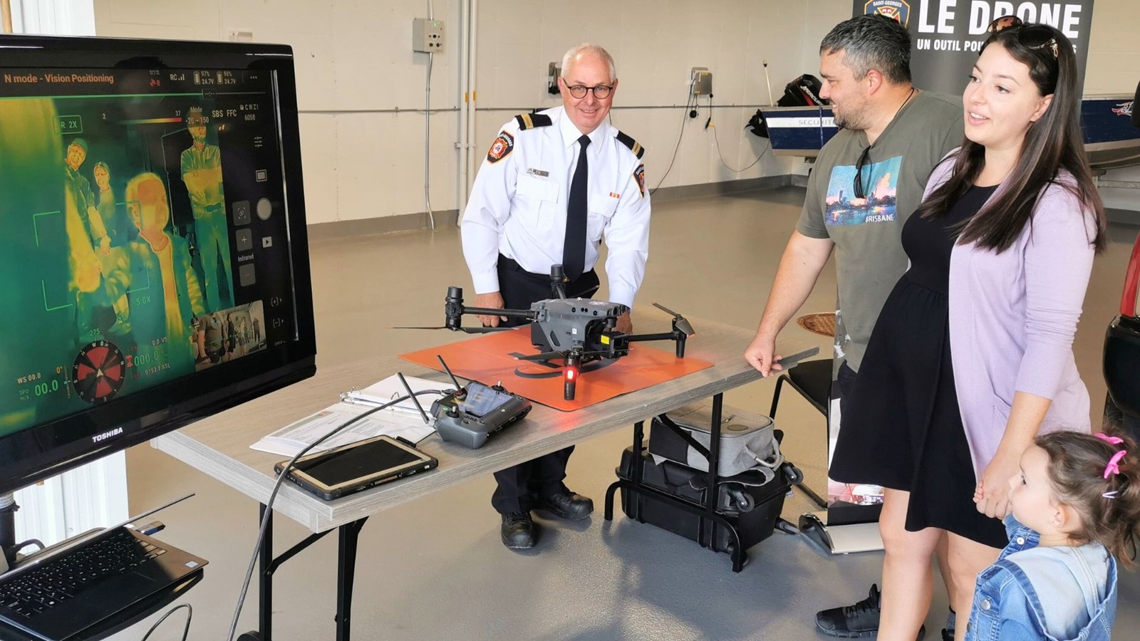 Claude Busque explique à Vincent Maheux, Aniklaude Bélanger, et à la petite Olivia-Rose, le fonctionnement d'une caméra thermique montée sur un drone.