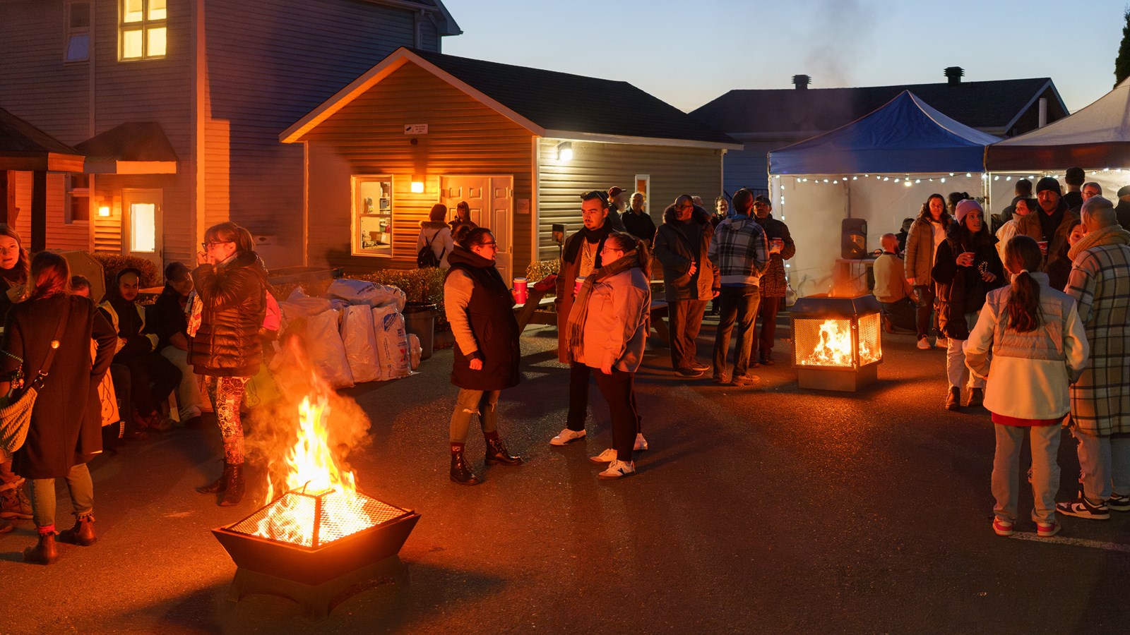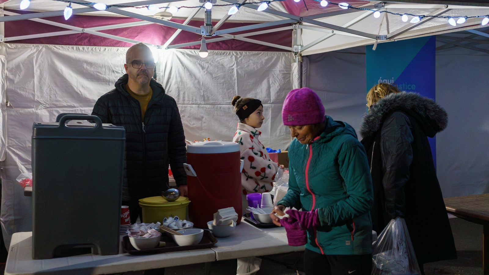 Les participants se sont réunis autour du feu pour échanger dans un esprit de bienveillance. Il y avait sur place la distribution de café, soupe et différentes collations. Ce sont 14 étudiants de la Formation menant à l'exercice d'un métier semi-spécialisé (FMS) de la polyvalente de Saint-Georges qui ont cuisiné pour l’événement. Il y a eu également des dons de nombreux manteaux, chaussures, trousses d'hygiène, tuques et cache-cous (tricotés par les élèves du service de garde et leurs éducatrices, à l’école primaire d’Adstock).