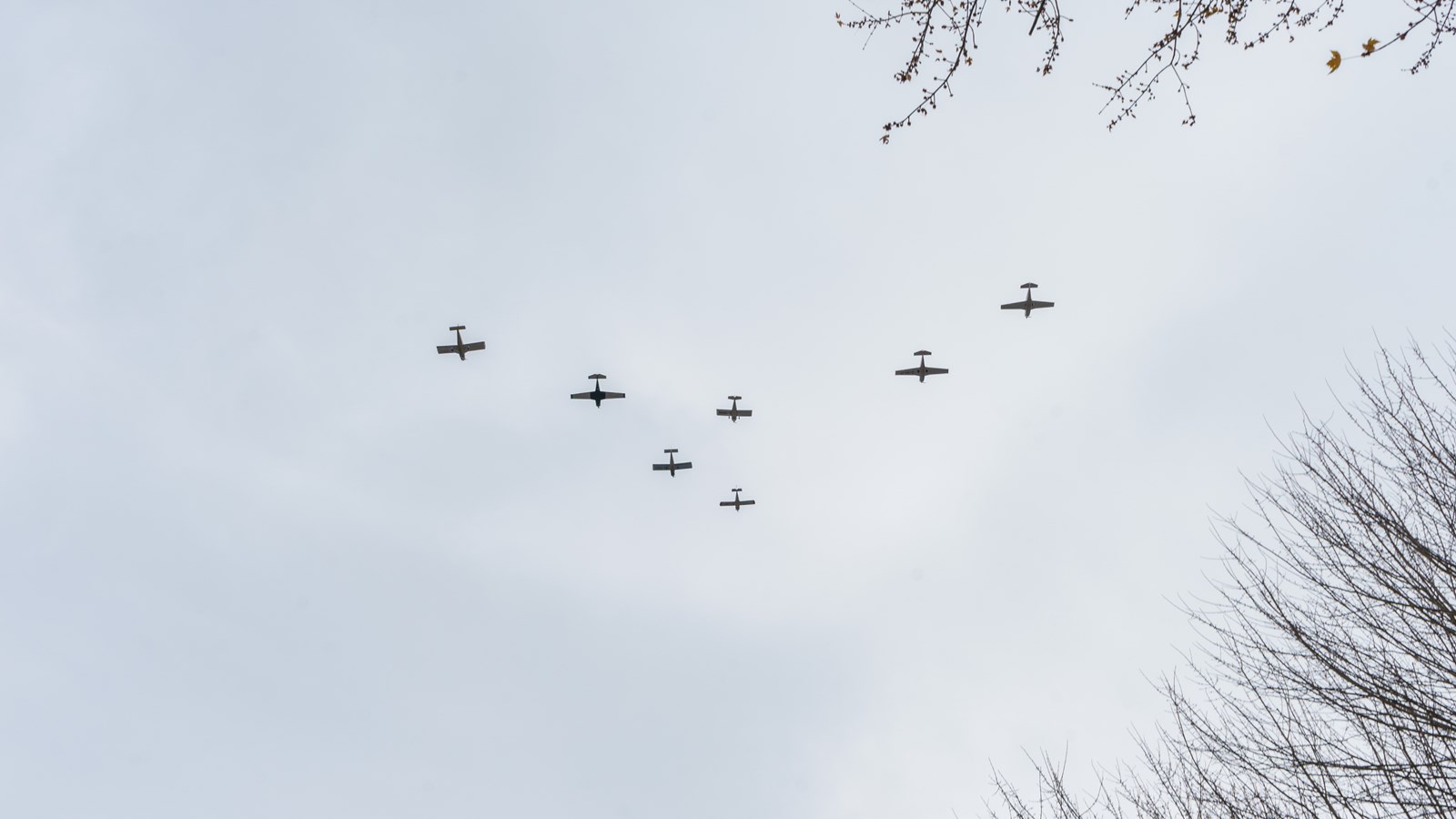Le Club d’aéronautique de Beauce a volé au-dessus du cénotaphe durant la cérémonie. Les avions ont réalisé la formation aérienne Missing man, comme le veut la tradition notamment pour les cérémonies funéraires de pilotes morts en mission. La première fois qu’elle a été utilisée pour une autre personne qu’un militaire, c’était en 1936 pour le roi Georges V.