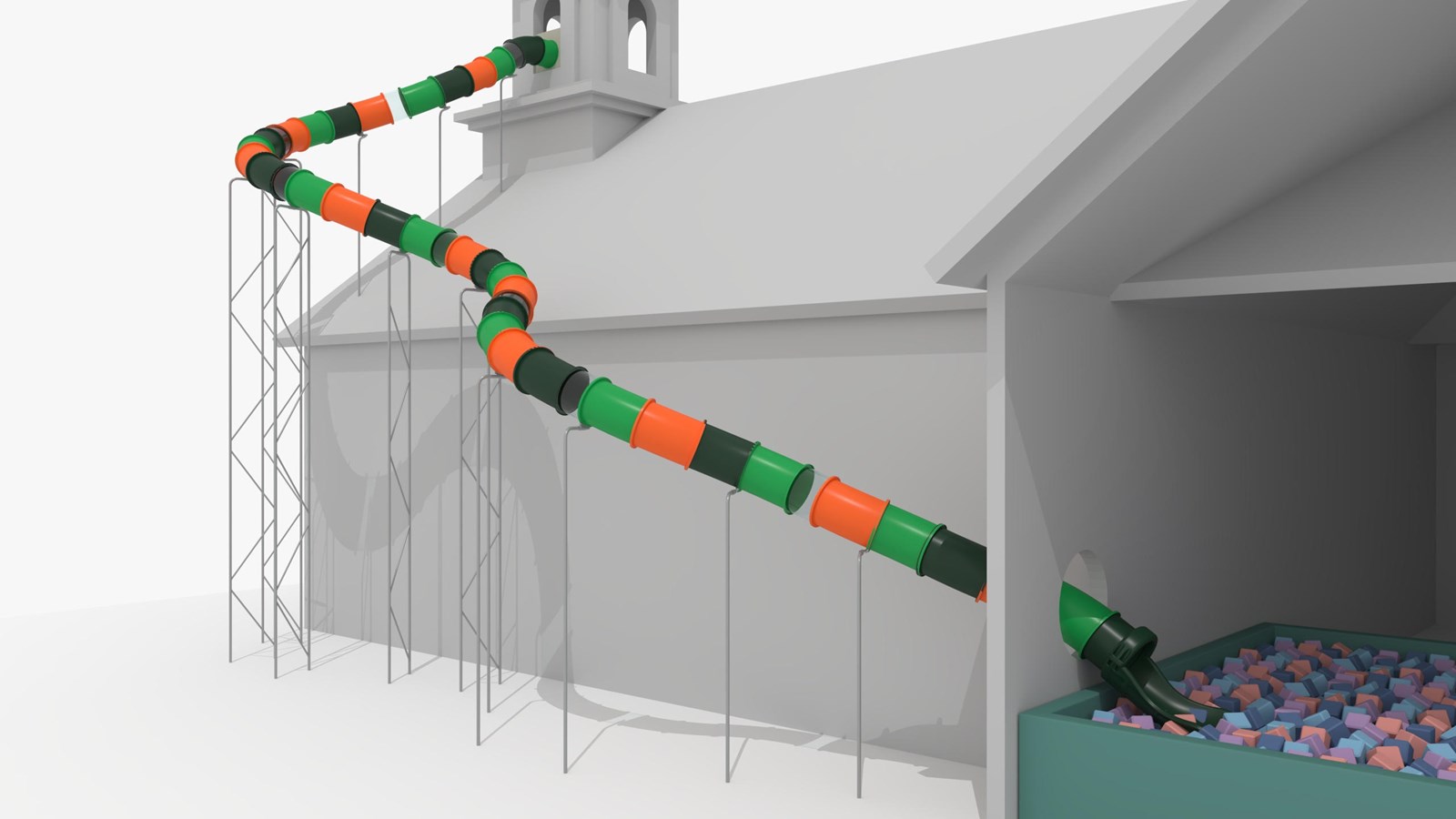 L’élément le plus audacieux demeure toutefois une glissade géante partant du clocher. « C’est le plus gros enjeu du projet, reconnaît Clifford Miller. La glissade va partir de l’actuel clocher, à environ 50 pieds de haut, sortir à l’extérieur de l’église, puis y rentrer à nouveau pour atterrir dans un gros bac de blocs de mousse. On sait que c’est du jamais vu. »