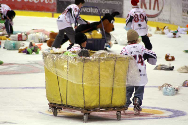 Les jeunes hockeyeurs ont eu un plaisir fou à récolter les toutous sur la glace.