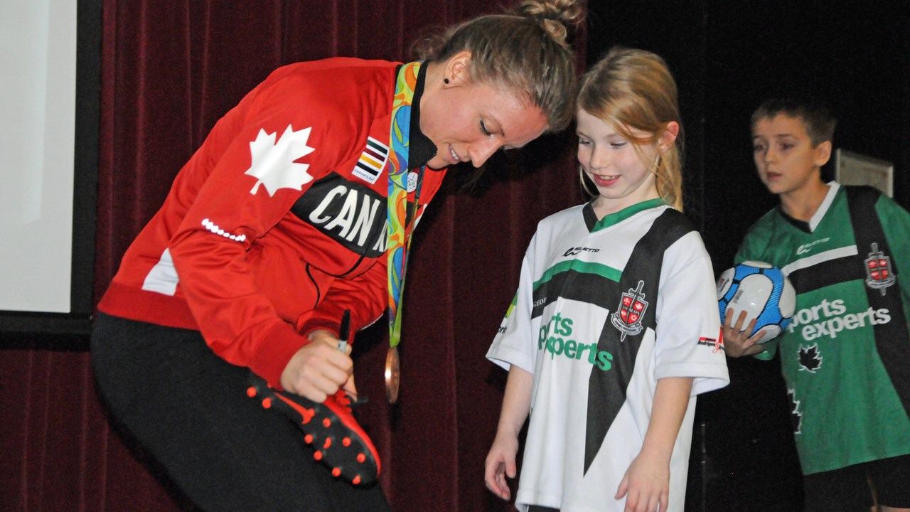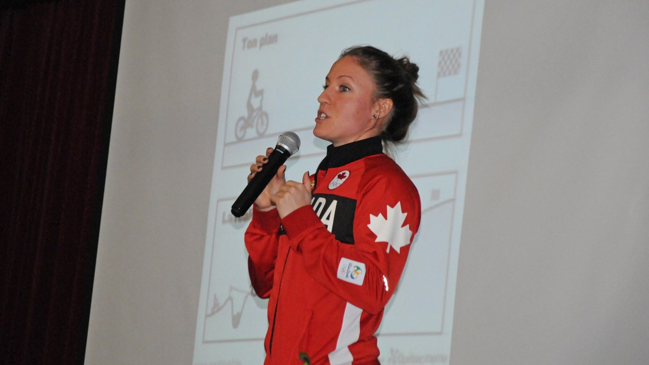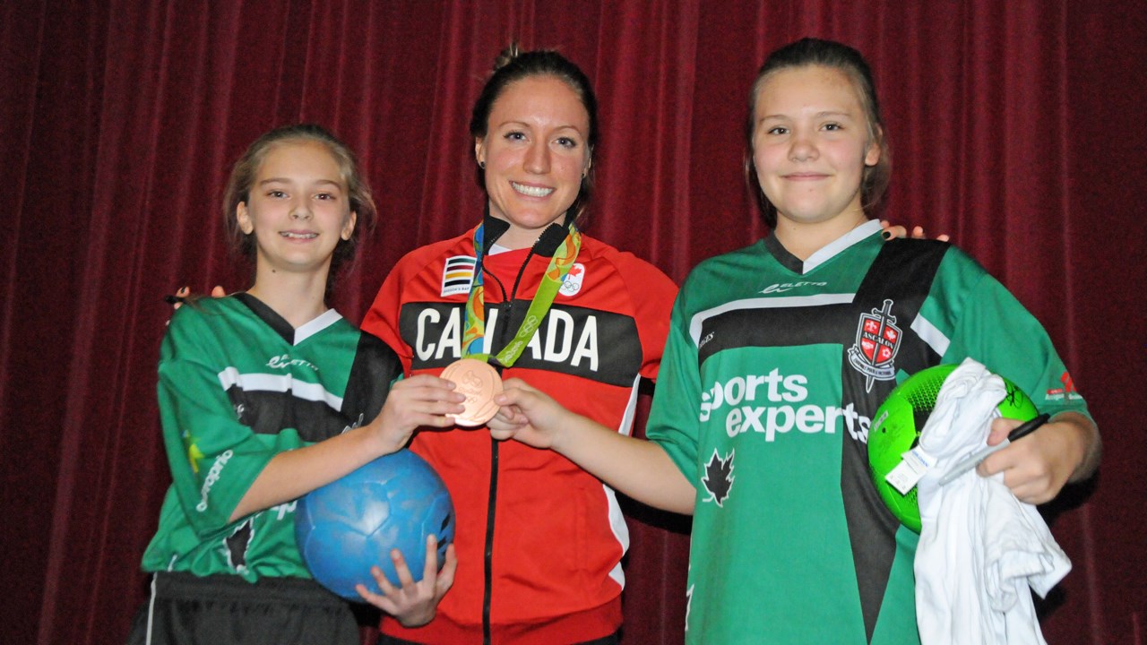 La sportive originaire de Coaticook a livré une conférence hier à l'École des Deux-Rives de Saint-Georges après avoir supervisé les entraînements des équipes de soccer de l'Ascalon.