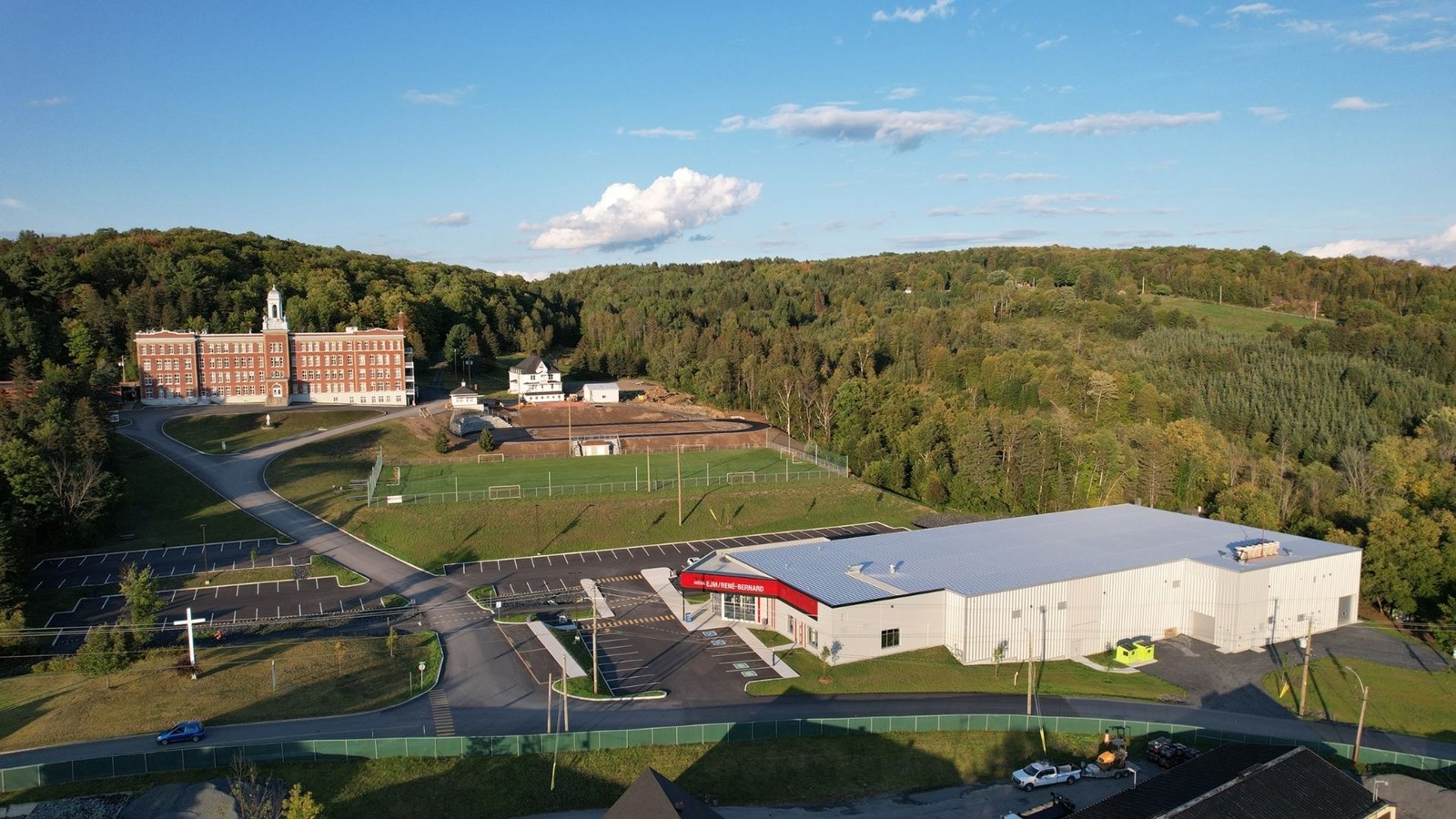 Les 600 000$ de l'école Jésus-Marie sont versés pour le nouvel aréna, auquel montant s'ajoutent les 200 000$ de l'entreprise René Bernard, d'où la désignation d'Aréna EJM/René-Bernard