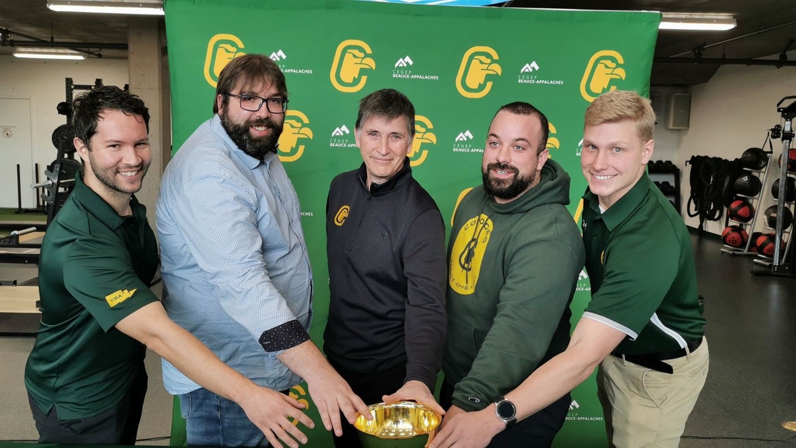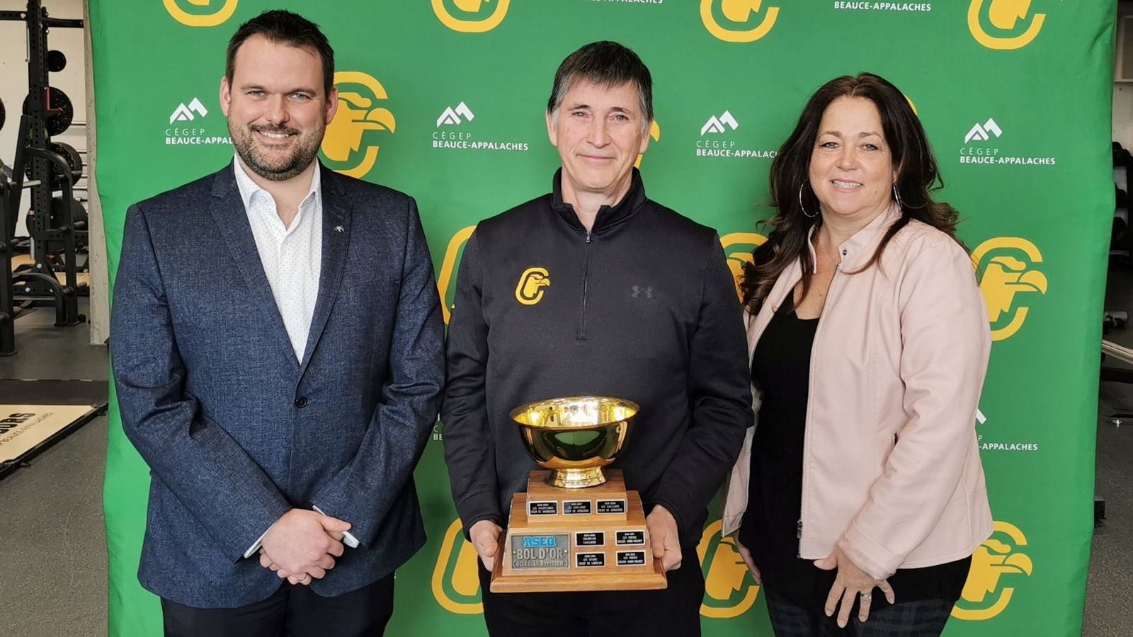 Le directeur des études et de la vie étudiante, Jean-Philippe Vachon, l'entraîneur-chef, Marc Loranger et la directrice générale du Cégep Beauce-Appalaches, Caroline Bouchard, avec le Bol d'or remporté en novembre.