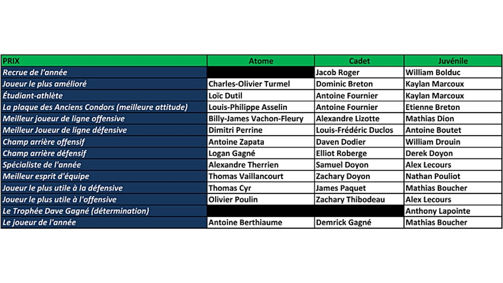 Dans la catégorie cadet, Zachary Thibodeau s’est vu remettre le prix du meilleur joueur offensif et James Paquet celui du meilleur joueur défensif, tandis que Demrick Gagné a hérité du titre de joueur de l’année.
