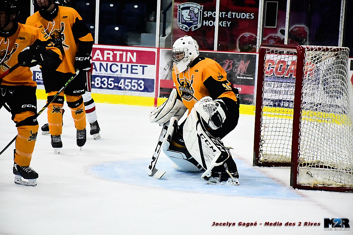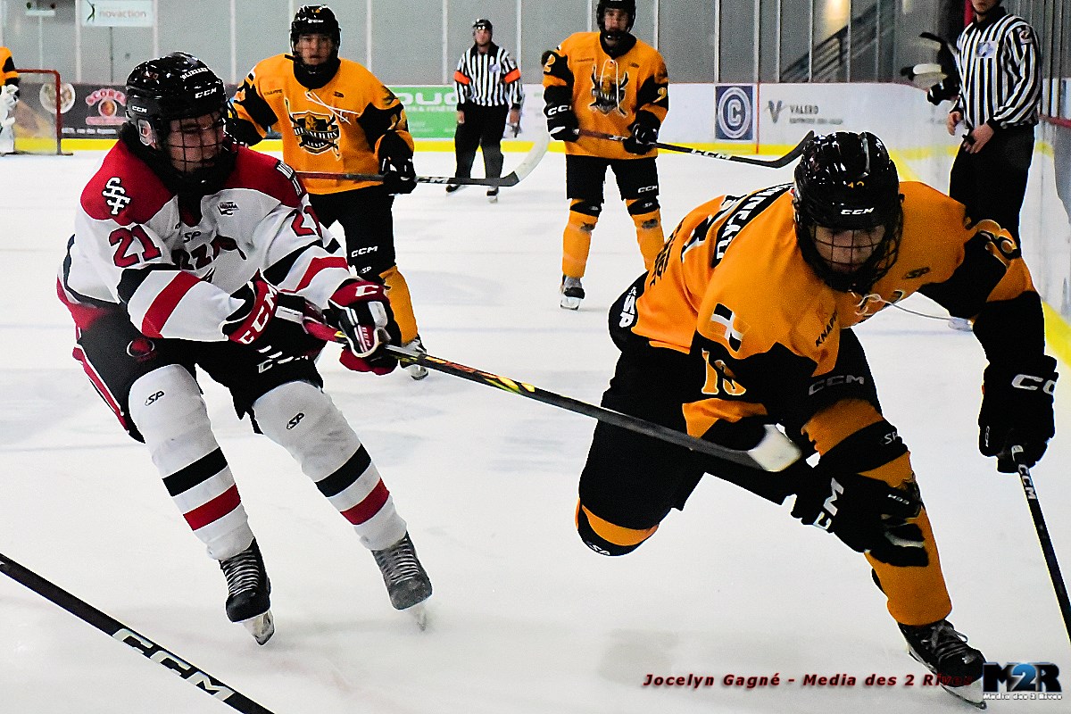 Les locaux inscrivent le premier but lorsque Justin Breton oublié dans l’enclave marque son 2e but de la saison. Justin Garneau et Victor Poulin sont ses complices sur le but. Quelques minutes plus tard, William Labranche profite d’un cafouillage derrière le filet des Chevaliers pour marquer.