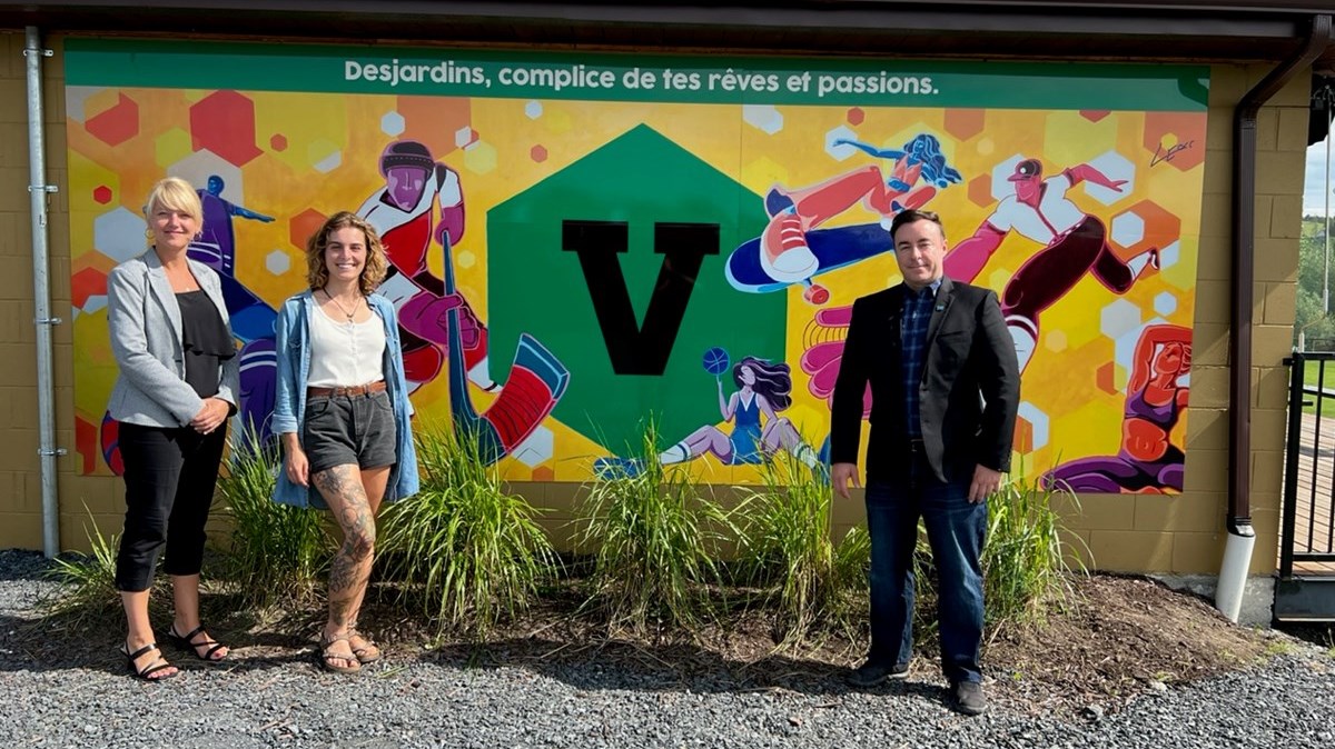 Photo 2 : Fresque réalisée par Léonie Champagne au centre, avec la DG de la Caisse Desjardins des Sommets de la Beauce Marie-Klaude Gagnon et le maire Jonathan V. Bolduc.
