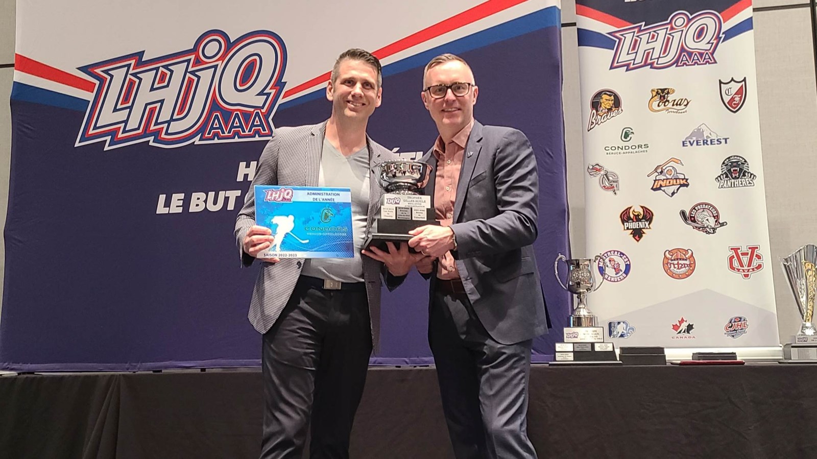 De l'administration à l'entraîneur-chef, en passant par les joueurs, les Condors étaient bien représentés lors de cette soirée de gala. En premier lieu, c'est d'abord une belle récompense pour l'équipe du Cégep Beauce-Appalaches avec le prix de l'administration de l'année 2022-2023, qui a été remis à Daniel Laflamme.