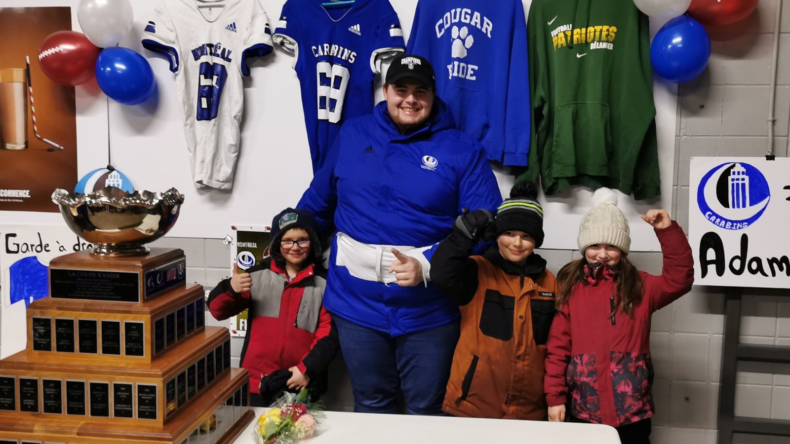 Ce soir, il écoutera le match du Super Bowl avec une main sur la Coupe Vanier, en espérant qu'un jour, ce puisse être le Trophée Vince-Lombardi! Pourquoi pas?