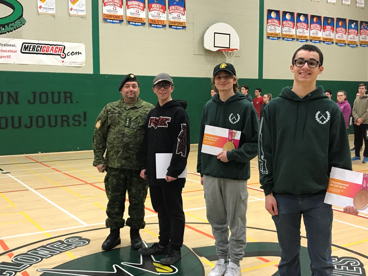 L’équipe du Corps de cadets 2898 Sainte-Marie : Capt Guillaume Paré (Entraineur), Akeem Lafrenière (Sainte-Marie), Hugo Pelletier (Scott), Nick Gosselin (Sainte-Marie), Étienne Felteau (Scott) et Anthony Bernard (Saint-Joseph)