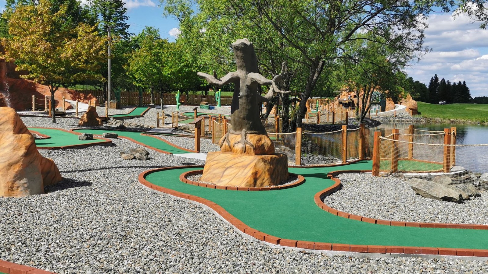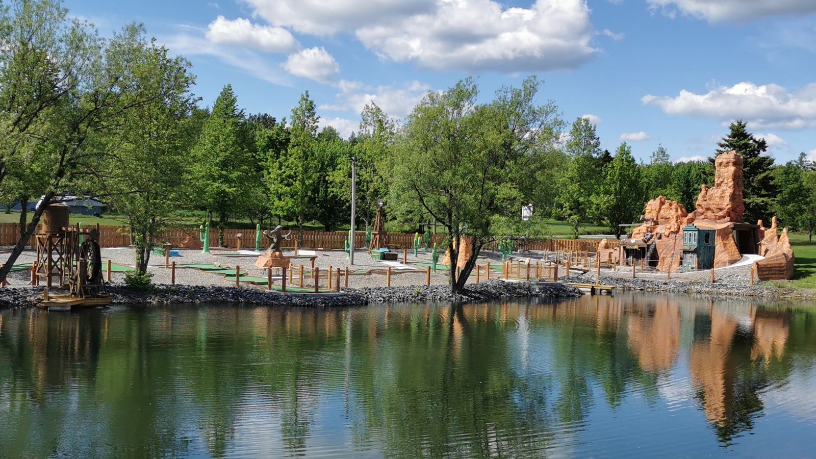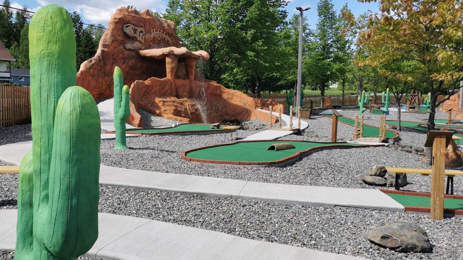 « On s’est en effet inspiré d’un concept américain pour réaliser un parcours qui devrait se réaliser en un peu plus d'une heure trente, d'expliquer le directeur Veilleux. Les 18 trous, ponctués de divers obstacles, vont de 25 à 125 pieds et totalisent 2000 pieds. Ils occupent un terrain de 35 000 p.c. On n’a pas non plus lésiné sur les décors, avec une cinquantaine d’éléments de décoration et des structures de plus de 40 pieds! » Le minigolf a nécessité un investissement de 600 000 $, dont une subvention de 100 000 $ est venue de Tourisme Chaudière-Appalaches.