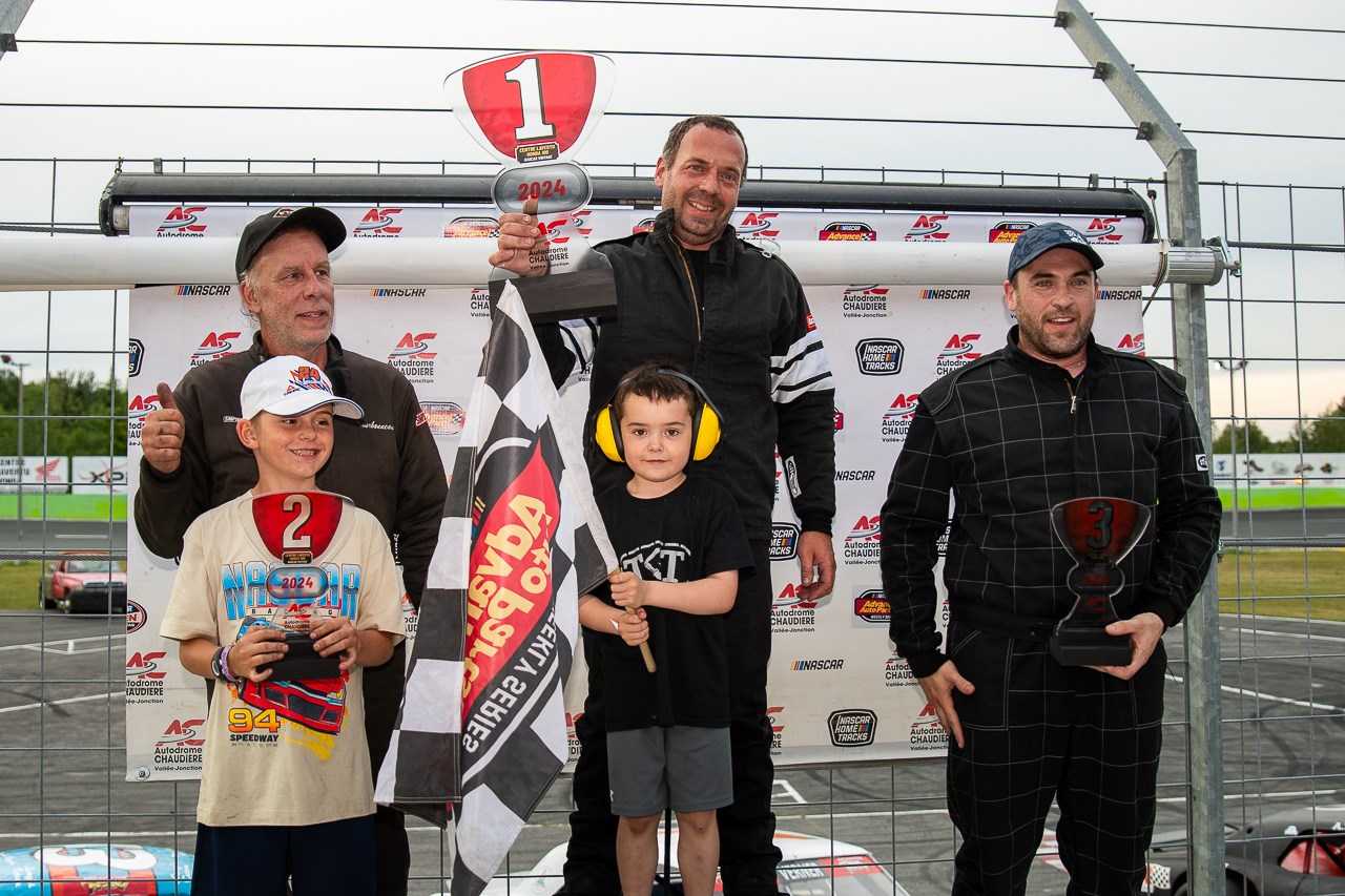 Les rutilants bolides de la division Nascar Vintage ont foulé la piste avec 12 pilotes. Ce fut et de loin, l’une de leurs meilleures courses cette saison avec plusieurs tours consécutifs à 2 de large. Revenons aux séances de qualifications qui ont donné lieu à de belles batailles. La première fût remportée par Claude Jean 10ME, commandité par Gourgue Racing Engine et la seconde par Maxime Gagné no.43, sponsorisé par Pièces d’autos Économiques et Construction LPJ. La finale de 50 tours se déroula à toute allure. Alexandre Tessier no.34 prit les devants dans les premiers tours et fût intouchable le restant de l’épreuve. Le peloton étant très resserré et les dépassements presque impossibles, les pilotes ont dû jumeler patience et respect, ce qui est tout à leur honneur! Au final, Tessier no.34 monte sur la plus haute marche du podium, suivi de Patrick Verner no.77 commandité par Garage Michel Dupont Pointe du Lac et Déneigement Stéphane Bernard en 2e position et de Maxime Gagné no.43 en 3e position. Le top 5 est clôturé par Martin Lacombe no.33 et de Claude Goupil no.71