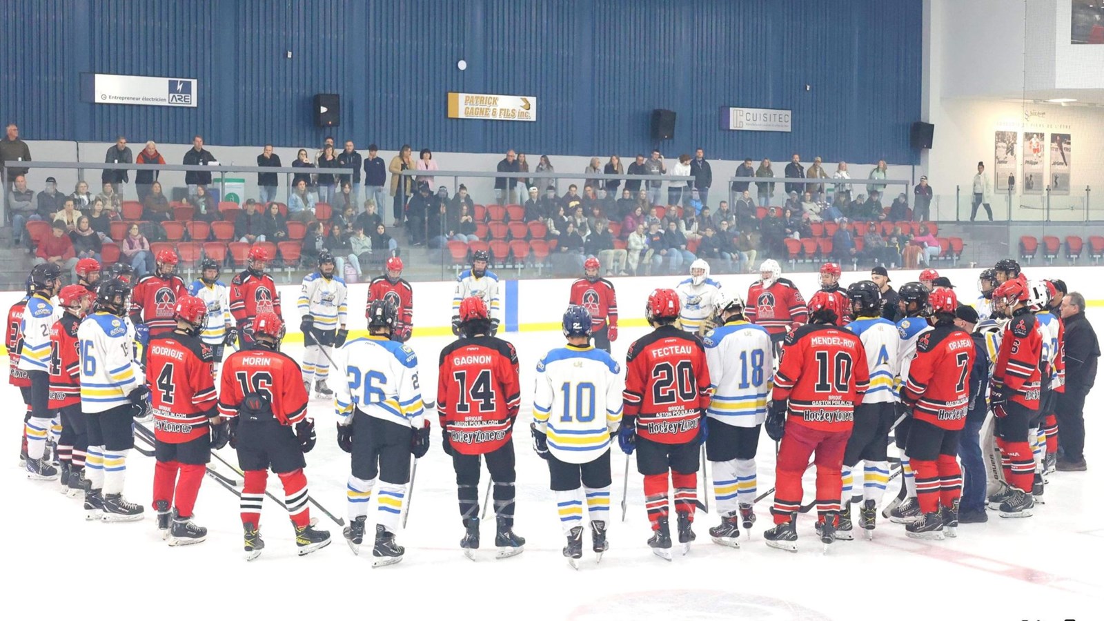Avant la partie avec la famille du défunt, les deux équipes se sont rassemblées au centre de la glace pour tenir une minute de silence en l'honneur d'Yves Walsh, de Saint-Georges, décédé la semaine dernière. Ce bénévole a consacré une une quarantaine d’années, au sein de l’Association de hockey mineur de Saint-Georges, dont notamment avec la formation du Beauce Mitsubishi.