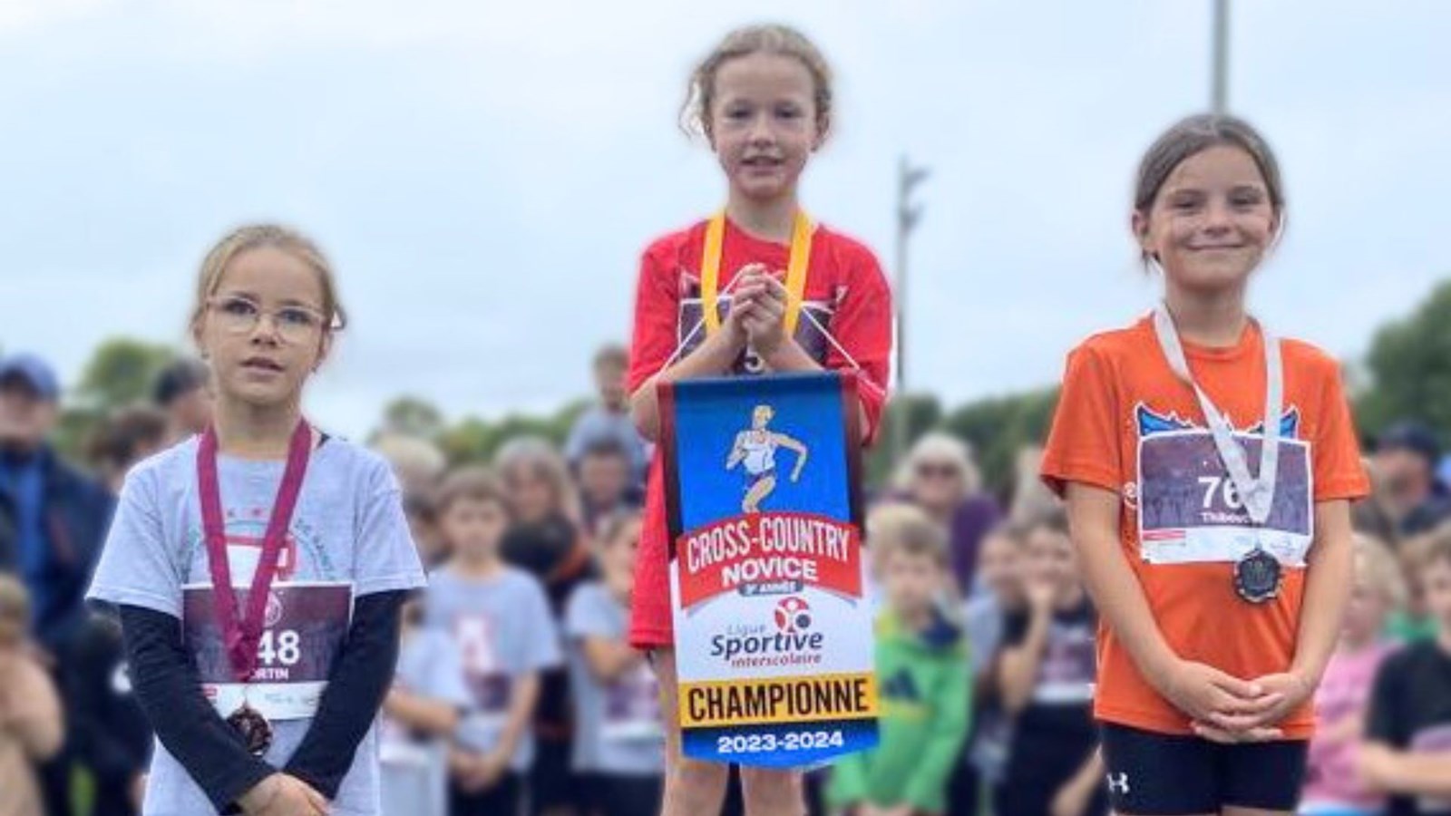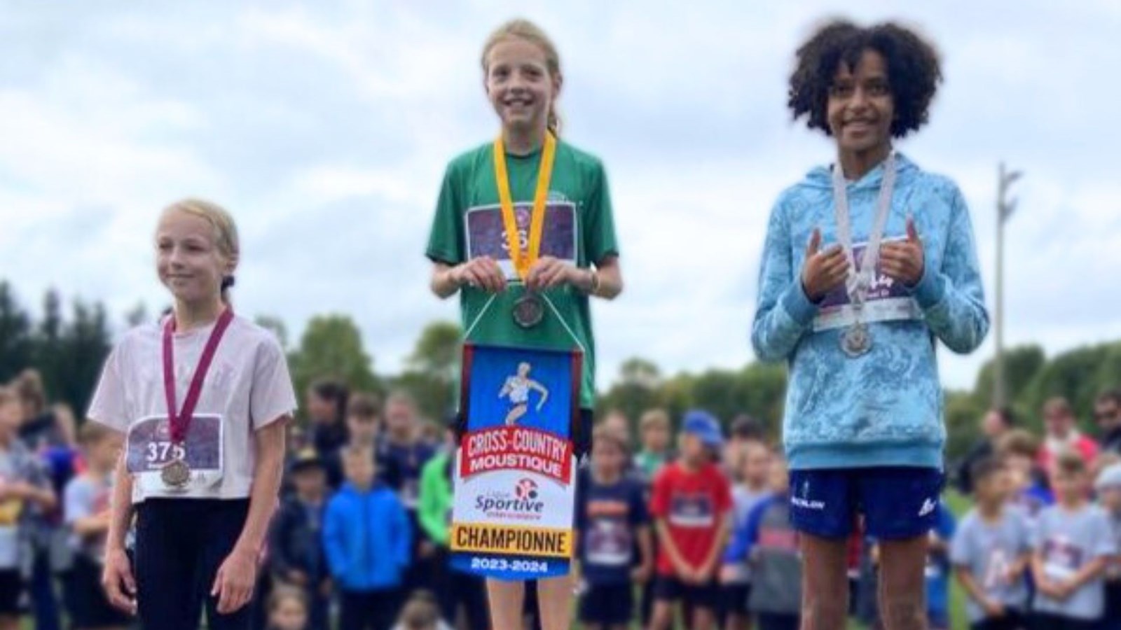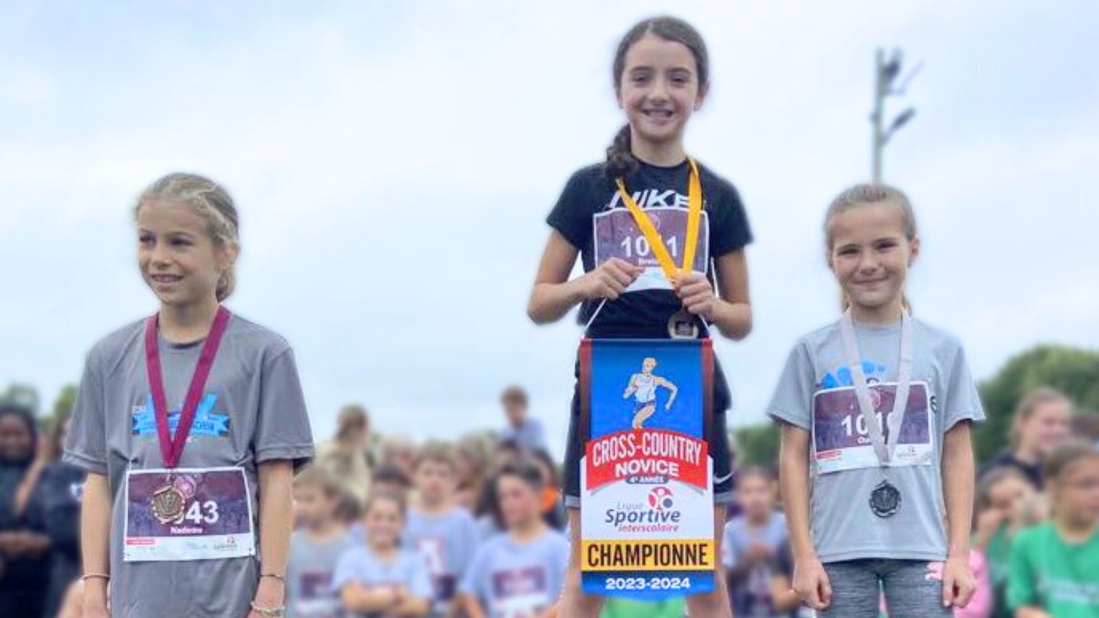 Podium Novice féminin 4e année (1 km): 1- Clara Breton/La Source, 2- Arielle OuelletLa Source, et 3- Charlotte Nadeau/Louis-Albert-Vachon.