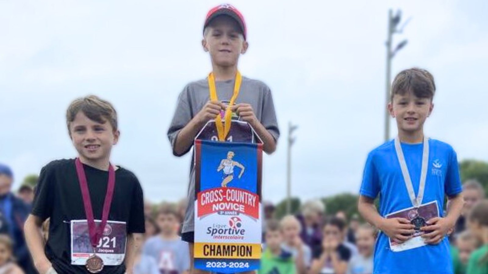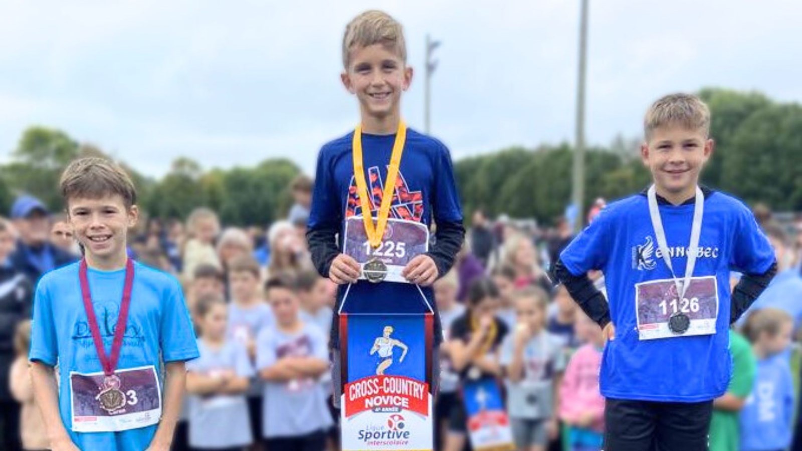 Podium Novice masculin 4e année (1 km): 1- Sam DrouinNotre-Dame de Saint-Elzéar, 2- Édouard PoirierKennebec, et 3- Zachary Caronde Léry-Monseigneur-De Laval.