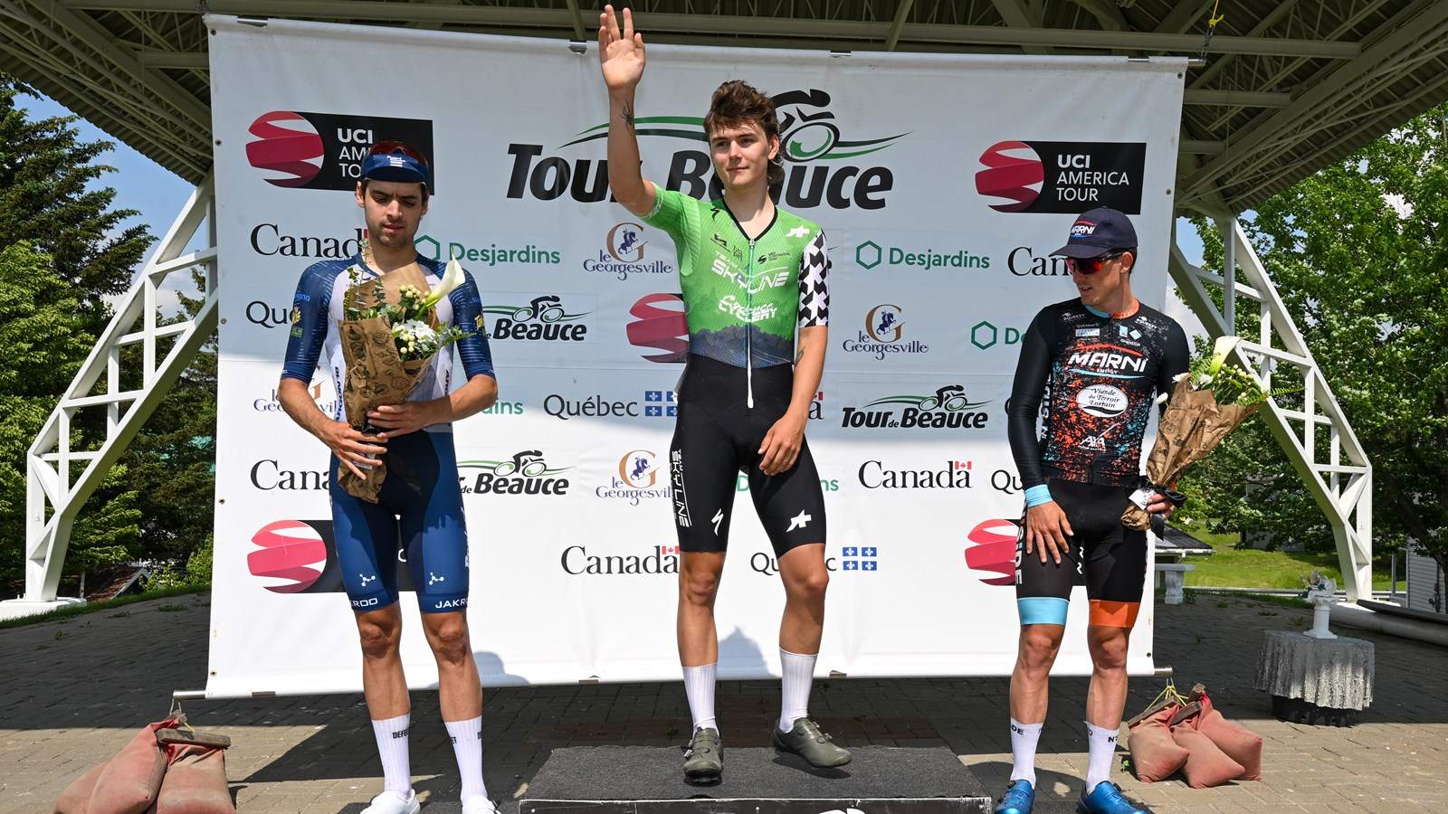Le Québécois de 20 ans réalise un très bon coup en mettant aussi la main sur le maillot blanc de meneur aux points, de même que le maillot rouge de meilleur jeune de moins de 23 ans au classement.