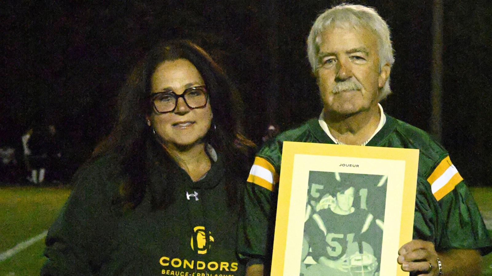 C’est avec fierté et respect que la directrice générale, Caroline Bouchard, a remis à la famille de monsieur Gravel, ainsi qu’à monsieur Poulin, une plaque honorifique afin de souligner leur contribution exceptionnelle et l’héritage qu’ils laissent au football collégial en Beauce.