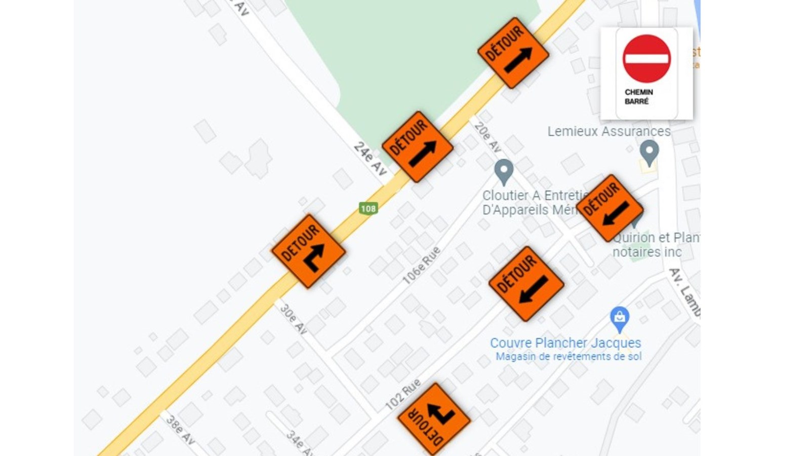 Le détour se fait par la 102e rue, la 38e avenue et la route 108.