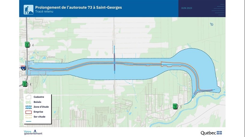 Rappelons que le projet consiste à construire un lien routier, sur une distance approximative de 7 km, au sud de la route 204 jusqu’à la route 173, au sud de la 208e Rue, à Saint-Georges. Le nouveau tronçon sera à chaussée unique et à deux voies contiguës, c’est-à-dire à contresens. La construction de ce lien routier inclura l’aménagement de carrefours giratoires et le réaménagement de celui en place à la route 204. Le projet prévoit également l’aménagement d’une voie auxiliaire pour véhicules lents, d’un passage souterrain ou d’une traverse à niveau pour les véhicules hors route (VHR), la construction de six structures au-dessus de cours d’eau ainsi que l’installation de clôtures d'exclusion faunique.