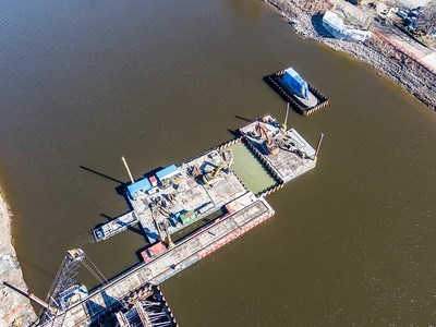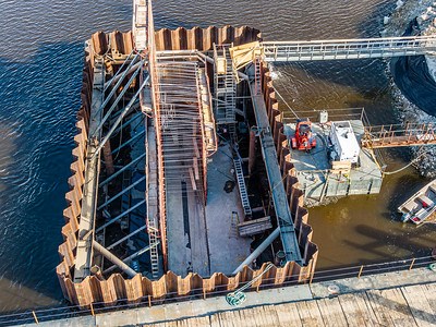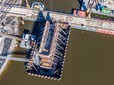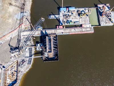 On peut voir notamment le coffrage de béton du premier pilier qui soutiendra une des cinq traverses qui constitueront le pont.