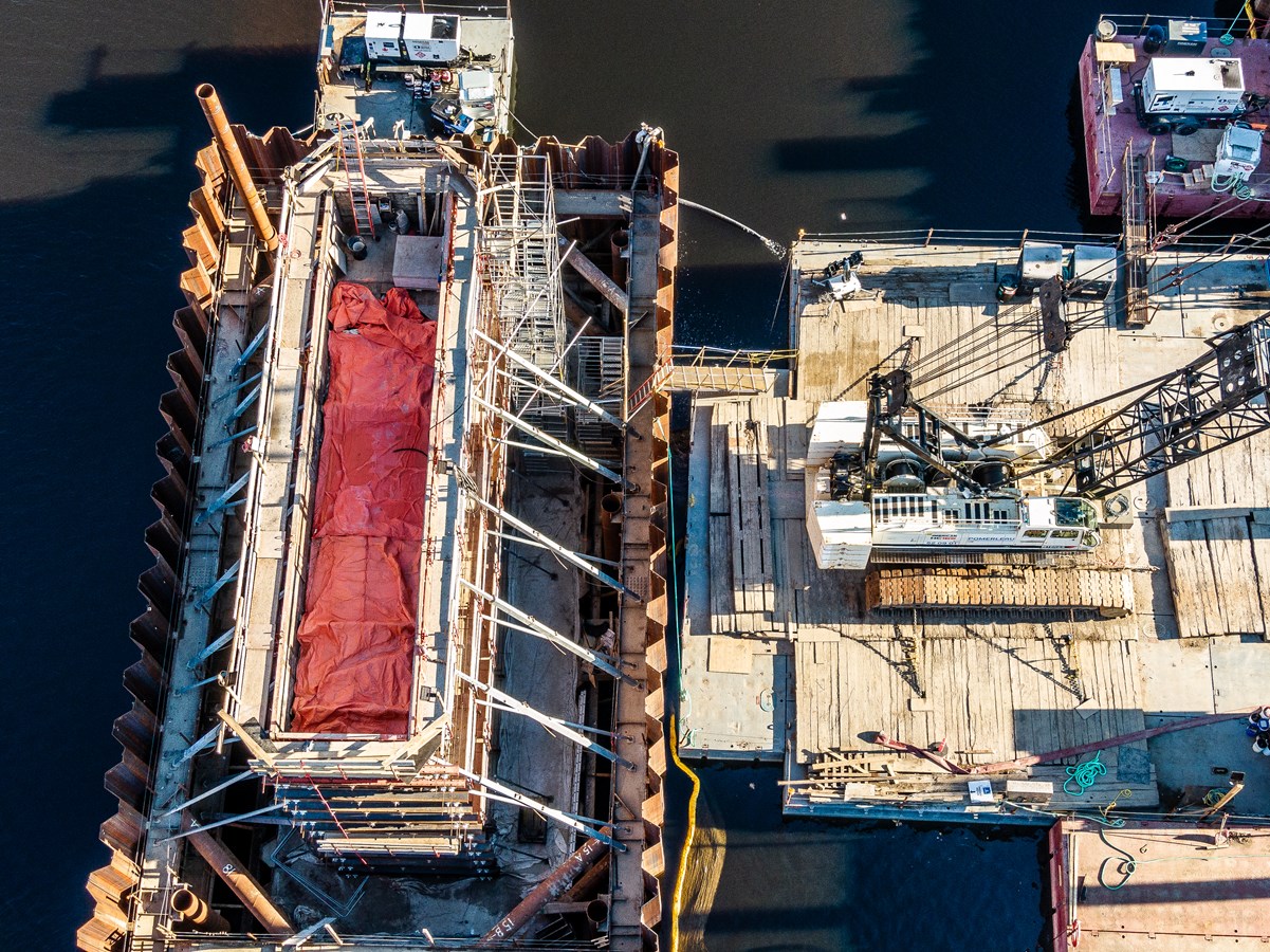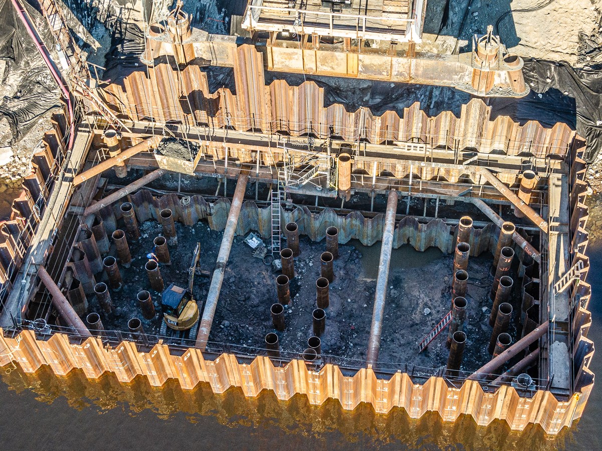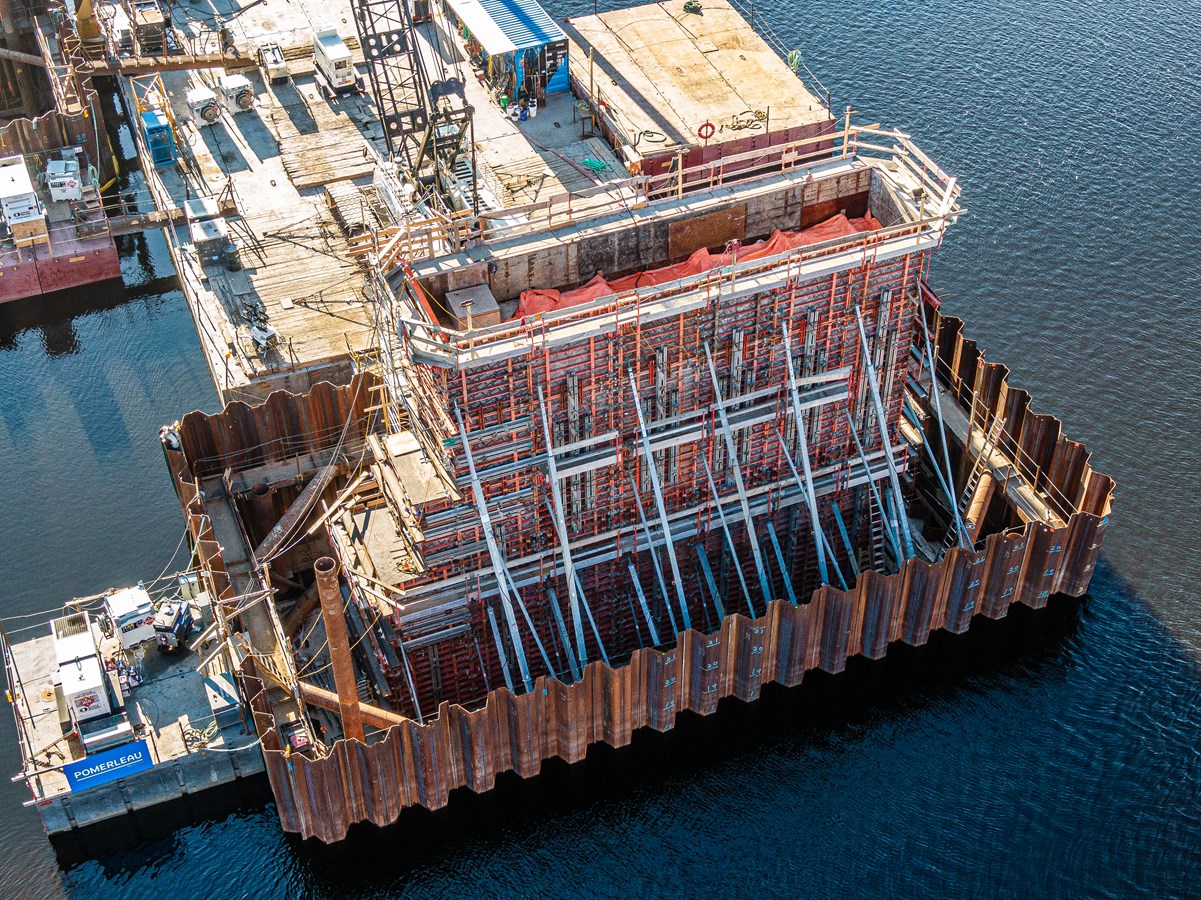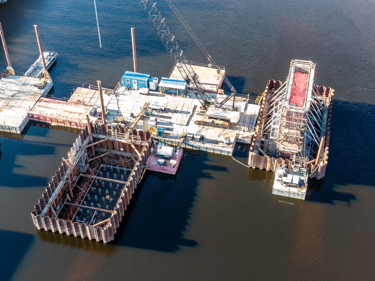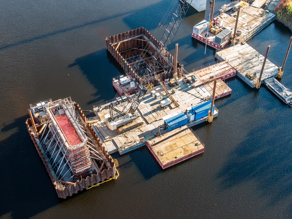 Les travaux de construction du pont ferroviaire qui enjambera la rivière Chaudière vont bon train à Vallée-Jonction.