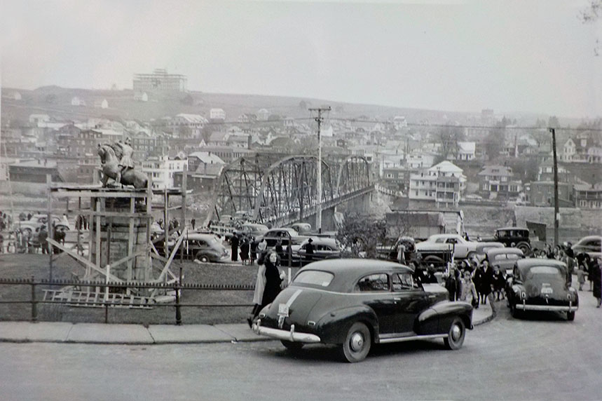 La Fabrique lança un appel de soumissions en 1908 pour la sculpture de saint Georges terrassant un dragon. Deux soumissions furent reçues et c'est celle de Louis Jobin qui fut retenue en 1909 au prix de 500$ transport non compris. Il fallait aussi un socle digne de recevoir cet oeuvre d'art remarquable. Le piédestal de pierres de Deschambault a été exécuté par Olivier Jacques d'après les plans des architectes Ouellet et Lévesque de Québec. L'épigraphe à l'endos (que l'on peut lire sur la 2e photo) est l'oeuvre d'un M. Roberge, tailleur de pierre à la main. Finalement, ce piédestal, qui pèse près d'une tonne et fait presque deux mètres de hauteur, a coûté au total 2217,20$ et est également classé patrimonial. L'installation de la statue équestre a été faite en 1912 sur la grande place en face de l'église. Sa bénédiction officielle a a eu lieu le dimanche 15 juin 1913, en même temps que celle du nouveau pont de fer (photo 3). Cette cérémonie donna lieu à un rassemblement grandiose de près de 5000 personnes, en présence de tous les notables de la région.