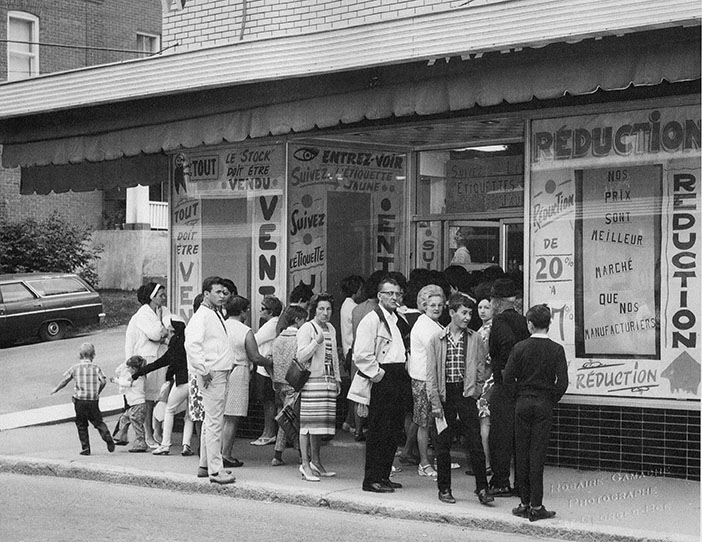 La 1re photo (de 1967) nous le montre dans toute sa splendeur, tel que la majorité d'entre nous l'avons connu. M. Morris Davis est celui qu'on voit sur le seuil du magasin, prêt à accueillir la clientèle. Il y vendait des vêtements de qualité pour hommes, dames et enfants à des prix très abordables, même des robes de mariées. À chaque mois de juillet, il tenait sa grande vente des «étiquettes jaunes», contrairement aux autres magasins qui annoncent généralement leurs rabais au moyen d'étiquettes rouges. Ses ventes étaient renommées, les clients faisaient même la queue très tôt le matin pour être les premiers à choisir, comme on le voit à la 2e photo prise le 8 juillet 1967 (la dame au centre, à la robe rayée, est Mme Jeanne d'Arc Pomerleau). M. Davis était un homme très affable et apprécié de la clientèle et de son propre personnel. Pendant plusieurs années, il comptait jusqu'à 20 employé(e)s. Son commerce a atteint son apogée entre 1960 et 1990. Il a été celui qui a persisté le plus longtemps, résistant à la tentation d'aller s'installer dans un centre d'achat. Mais les trois autres grands (Farmer, Green et Peoples) étant partis dans les années '75, il a finalement baissé pavillon et fermé son célèbre magasin en 1990. Un jour triste pour ses anciens clients.