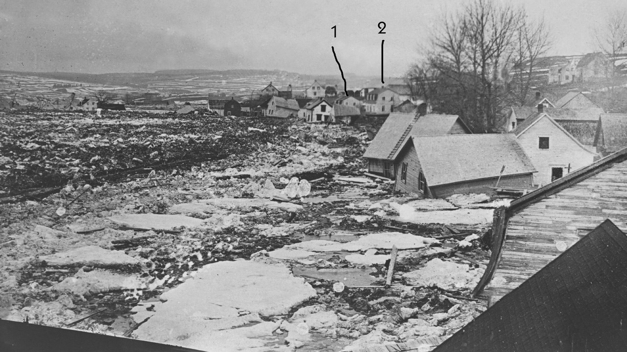 Lorsqu'on examine les milliers de photos anciennes de la SHS, on fait parfois des découvertes surprenantes. J'ai déjà publié la description de la pire débâcle printanière survenue dans l'histoire de Saint-Georges (incluant 7 photos). C'était en avril 1896, débâcle qui a duré du 14 au 22 avril, des montagnes de glaces ayant envahi le secteur près de la rivière. Des dizaines de bâtiments ont été détruits ou emportés par les glaces. Je publie une photo de ce terrible désastre, prise vers le 20 avril 1896 par le photographe J. A. Gagnon. On y voit un secteur de la 1re Avenue, au centre-ville, où plusieurs résidences flottent à la dérive. J'ai mis deux flèches pointant deux résidences qui ont tenu le coup. Celles-ci sont faciles à identifier car elles ont toutes deux des toits à mansarde avec lucarnes, la no 1 ayant deux lucarnes et la no 2 (de couleur blanche) ayant 3 lucarnes. Je publie une autre photo (la 2e) qui date des environs de 1943, illustrant le secteur environnant, avec les deux mêmes maisons qui sont bien toujours là (dans le coin inférieur à gauche), plusieurs décennies après les catastrophes auxquelles elles ont survécu. Et finalement une 3e photo (en couleur) datant de 1966. Surprise: on y aperçoit nos deux maisons survivantes et semblant en bon état. En fait, la première (de couleur rouge) est l'ancienne maison dite de Marie-Tomiche à l'intersection de la 114e Rue et la seconde (blanche) est un peu plus à droite, elle a été pendant 2 ans le site du studio de photographie de M. Rouville Gagnon dans les années '66-'67, puis a été achetée par les ingénieurs Labbé et Dion qui y ont établi leur bureau (au niveau du rez-de-chaussée) jusqu'en 1988. Elles furent toutes deux démolies, la blanche en 1988 pour y ériger l'Édifice à bureaux Canam-Manac et la rouge en 1992 pour élargir la 114e Rue. Incroyable: elles ont été capables de survivre à cette monstrueuse débâcle ainsi qu'au terrible incendie de 1915 qui détruisit plus de 50 maisons au centre-ville, le feu ne s'arrêtant qu'à un coin de rue de ces deux miraculées. Triste de penser qu'après avoir servi pendant plus de 100 ans et avoir survécu à deux tels désastres, elles sont tombées bêtement sous le pic des démolisseurs. On n'arrête pas le progrès!