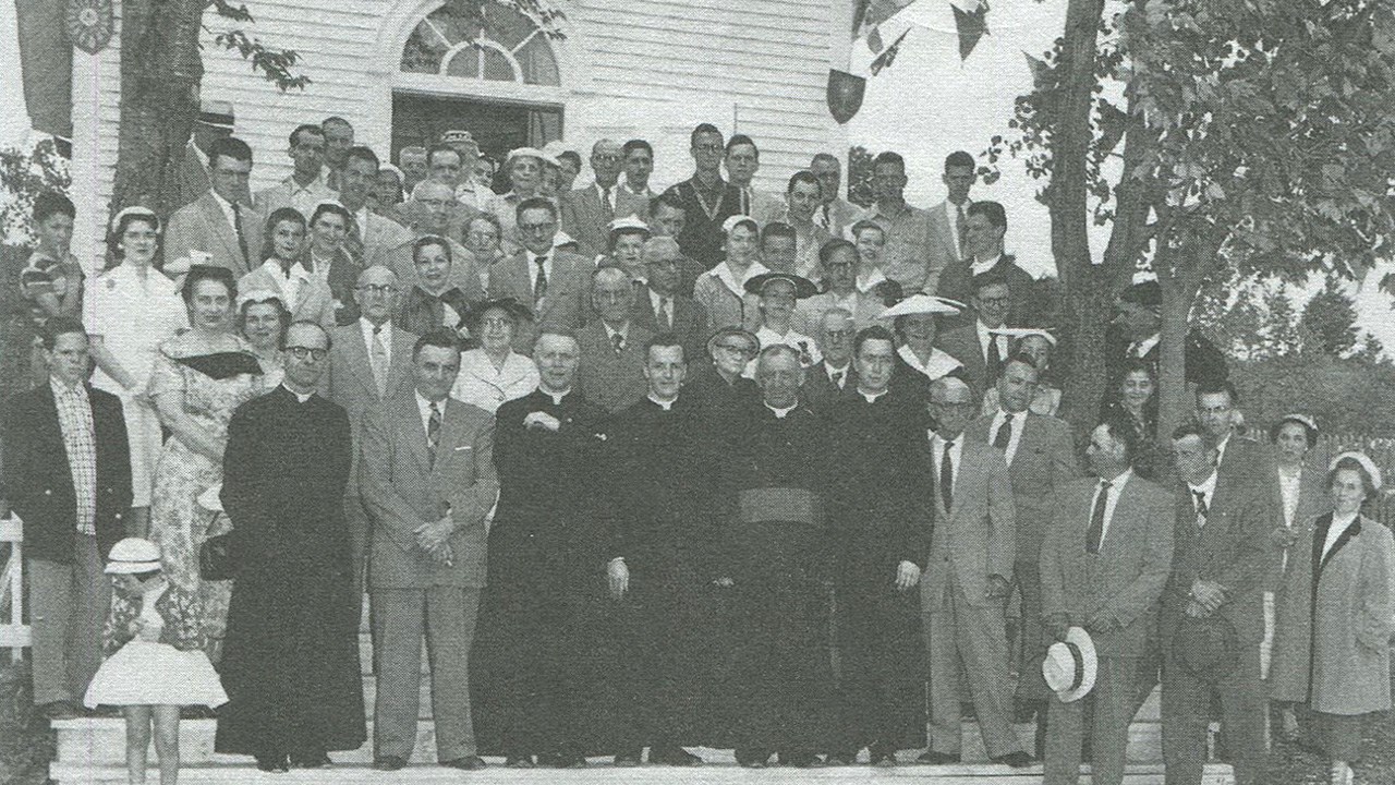 En 1954, événement important dans la vie de cette chapelle: J. Édouard Poulin accepta d'en faire don aux résidents du Lac Raquette à Saint-Benoît. Le transport eut lieu en plein hiver le 8 mars 1954. Pour éviter un grand détour et parce que l'édifice était peut-être trop élevé pour passer sous la structure supérieure de l'ancien pont de fer, on décida de traverser du côté ouest en passant sur la glace recouvrant la rivière en cette période de l'année. Hélas, l'imposant bulldozer qui remorquait la chapelle a défoncé la glace en achevant la traversée et s'est retrouvé immergé dans un mètre d'eau. Heureusement, un vrai miracle, le déménagement a quand même été un succès. La chapelle a été inaugurée au Lac Raquette le dimanche 27 juin 1954 en présence de nombreux dignitaires (photo 3). Cette chapelle pouvait accueillir plus de 100 personnes, on l'a entièrement rénovée en 1990. En raison de sa popularité à cette époque, les riverains du lac Raquette y ont même ajouté deux ailes au fil des ans (photo 4), on avait ainsi plus de places, pour jusqu'à 150 personnes. On peut encore la voir aujourd'hui, elle est toujours là. Elle a toute une histoire.