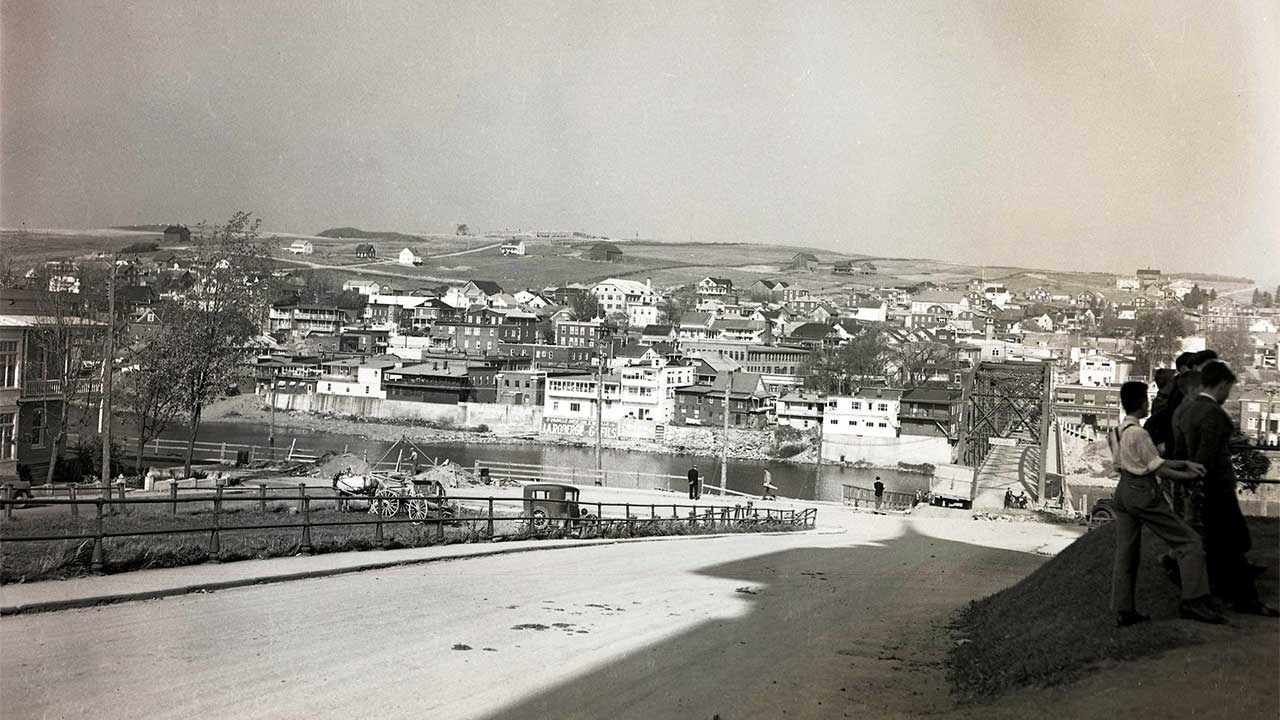Dans les années '30, le centre-ville, dans l'ouest, était situé autour de l'église et de la rue principale (1re avenue). Les ponts de 1912 et de 1929 furent construits au même endroit, tout juste en face de l'église. La sortie du pont dans l'ouest donnait sur une belle rue menant tout droit à l'église (photo 1), mais cette rue était en forme de fer à cheval, elle bifurquait devant l'église et revenait sur la 1re avenue. L'arrivée de la Dionne Spinning Mills sur le boulevard Dionne, en 1940, provoqua un grand développement et la création de plusieurs rues nouvelles. La manufacture Dionne était située au coin du boulevard Dionne et de la 20e rue. Dès les premières années suivant la construction de son usine, Ludger Dionne espérait pouvoir bénéficier d'une rue directe au pont, en face de l'église. À l'époque, il y avait tout juste une ruelle entre le Couvent et le cimetière, assez large pour laisser passer une voiture à cheval, mais incapable de recevoir une véritable circulation. Dionne voulait une vraie rue et au début des années '40, il fit des pressions à ce sujet, menant une campagne en faveur de la création de cette artère. Il eut l'habileté de suggérer qu'on l'appelle la rue «Saint-Édouard» pour obtenir le soutien des deux Édouard importants de Saint-Georges: Édouard Lacroix et le curé Édouard Beaudoin (qui étaient d'ailleurs cousins). En 1940, il y avait près de l'église un stationnement pour les autos et un autre pour les voitures à cheval, mais c'était limité comme voie de circulation pour se rendre au pont. Il eut finalement gain de cause et, vers 1947, on «perça» une nouvelle rue qui reliait le boulevard Dionne au pont. La 2e photo illustre les travaux d'élargissement de la descente vers le pont et d'autres travaux d'améliorations sur la 1re avenue en prévision de la nouvelle rue projetée. La 3e photo démontre la rue en fer de cheval devant l'église ainsi que la nouvelle rue à gauche, soit la rue Saint-Édouard, qui fut réalisée dans la seconde moitié des années '40. Examinez bien la 4e photo (vers 1958): il y a une grosse borne en béton en plein milieu de l'entrée du pont sur laquelle est écrit «Gardez la droite». Le problème, c'est que cette rue n'arrivait pas exactement vis-à-vis du pont, mais à gauche. Les autos descendant de la rue Saint-Édouard (18e rue) et ceux arrivant de la 1re avenue par le nord avaient l'obligation de contourner cette borne par la droite pour s'engager sur le pont. C'était l'enfer pour les camions articulés (semi-remorques) qui devaient ralentir et zigzaguer pour réussir l'exploit de contourner cette satanée borne. Cette anomalie subsista aussi longtemps que le pont lui-même, soit jusqu'en 1971, année au cours de laquelle on ouvrit le pont actuel. Le pont de fer fut démoli au cours de la même année.