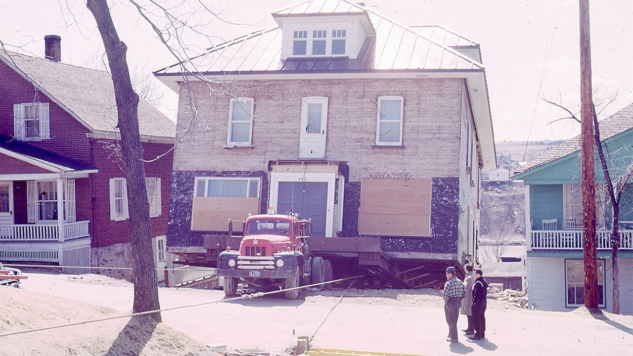 Vous vous demandez où vous avez déjà vu cette belle résidence montrée à la 1re photo. Un indice: sur l'imposante cheminée, un «D» pour Dutil, auquel on aurait tout aussi bien pu ajouter un «R» pour Roger Dutil qui y habita longtemps, puis son fils Raymond et sa famille qui y logèrent pendant plusieurs années. C'était sur le boulevard Lacroix, en face du Motel Voyageur. Mais ce n'était pas son premier emplacement. En effet, l'homme d'affaires Roger Dutil possédait cette maison dans les années '50 et '60 au numéro civique 12475 de la 1re avenue, au coin de la 125e rue (photo 2), correspondant aujourd'hui aux magasins Confection Simonne inc et Bicyclettes Chrono Cité. Il était le père de Marcel (Canam-Manac), Robert (ancien Ministre) et Anne Dutil (dirigeante et fondatrice de la Société Historique Sartigan), pour ne nommer que ceux-ci. En 1965, cette section de la 1re avenue étant devenue une artère très commerciale, M. Dutil négocia un important bail commercial avec la chaine de magasins Peoples devant être construit sur le site du terrain qui accueillait alors sa maison. Fallait donc la déménager pour libérer l'emplacement pour y ériger l'immeuble commercial. Ce sont les Frères Lachance, entrepreneurs en déménagement, qui furent chargés de cette délicate opération, en avril 1965. La première étape a été d'enlever la brique tout autour de la maison. On a alors pu la soulever très haut (photo 3) pour pouvoir passer en dessous le camion et la remorque où elle fut déposée pour le transport. On sait que ce secteur, en direction est, est très escarpé. Étonnamment, on a donc décidé de monter en se faufilant entre les maisons de la 2e avenue (photo 4), ce qui fut probablement un des moments les plus périlleux du déplacement. On monta ensuite dans la 123e rue et on tourna sur le boulevard Lacroix en direction nord, où le cortège s'engagea sur le viaduc. On compléta le reste du trajet sans anicroche et la maison circula sur cette artère pour environ 2 kilomètres et fut réinstallée en face du motel Voyageur, sur un site voisin de la résidence du beau-père de Roger Dutil, soit celle de M. Édouard Lacroix (il était décédé 2 ans auparavant, en 1963). M. Roger Dutil, puis son fils Raymond Dutil et sa famille y habitèrent pendant plusieurs années, jusque dans les années 2000. Le secteur étant encore devenu très commercial et achalandé, l'histoire s'est répétée. En 2004, il fut décidé d'y construire un gros immeuble à bureaux que tout le monde connait: le siège social régional de la Caisse Desjardins, voisin du Burger King. Cette fois, on ne l'a pas déménagée, il a donc fallu se résigner à démolir cette imposante résidence, ce qui fut fait au cours de l'avant-midi du 9 juin 2004, entre 7,30h et 11h de l'avant-midi. Surprenant comme le développement de notre ville a entrainé des chambardements majeurs. Une histoire vraiment spectaculaire mais si intéressante.