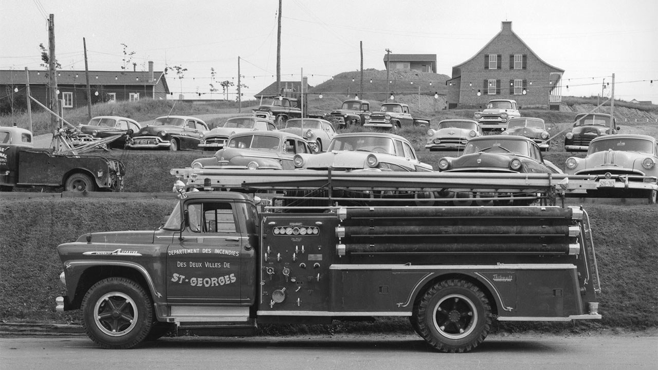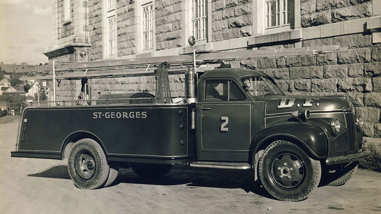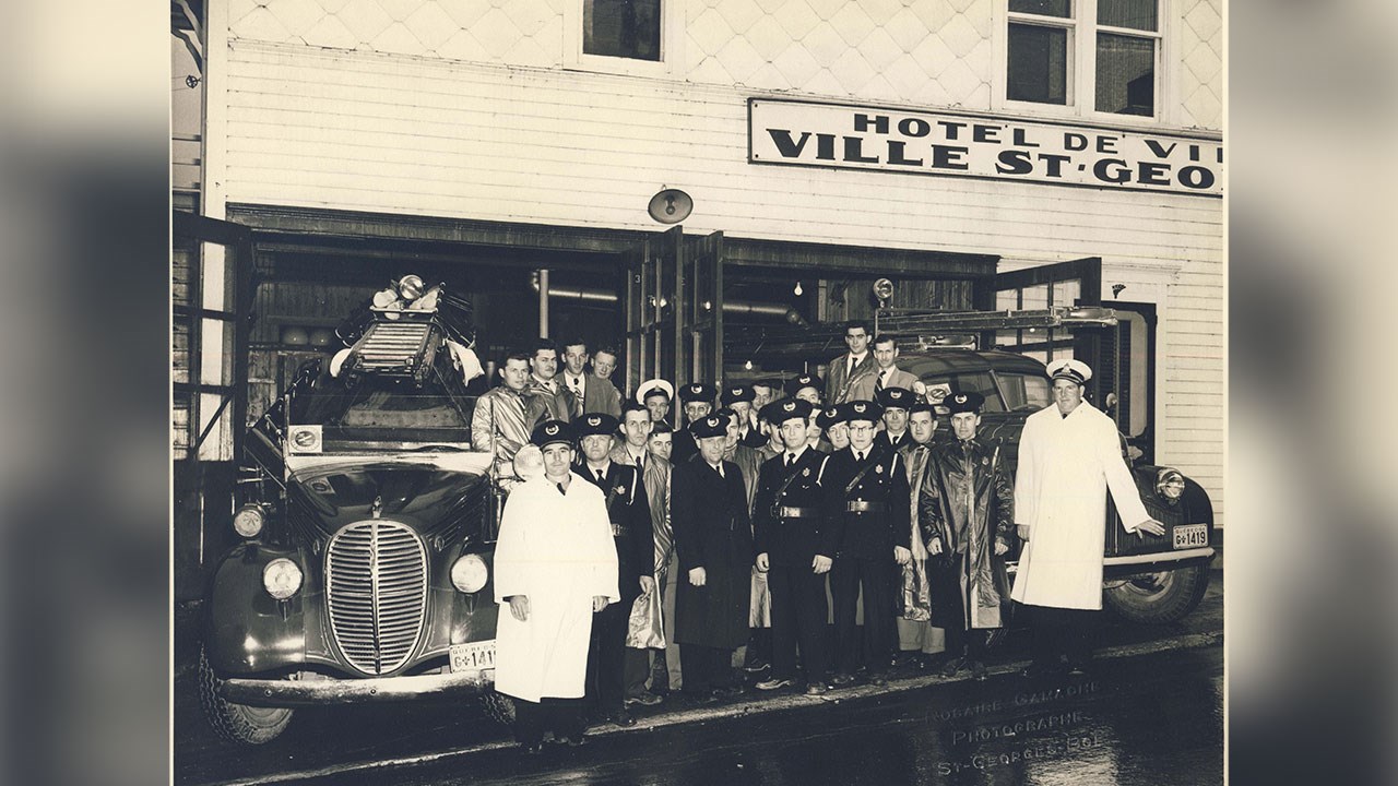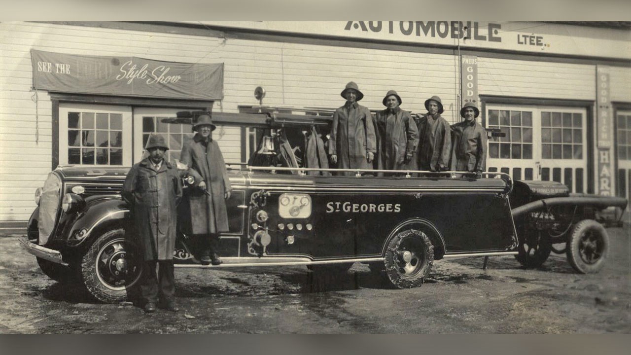 Le pire incendie de notre histoire est survenu le 21 novembre 1915. 50 édifices du centre-ville ont été détruits par le feu. Pendant l'incendie, on a réalisé que toute la ville risquait d'y passer, alors on a demandé l'aide des pompiers de Lévis. Quand ils sont arrivés (en train) avec leur équipement, le feu était terminé. Ne restaient plus que des ruines fumantes. Tout de même, cet événement a conscientisé nos ascendants à être mieux préparés à affronter une telle calamité dans le futur. Les dirigeants sont devenus plus attentifs aux moyens de prévention et à l'équipement requis pour combattre les incendies. Voici donc trois camions qu'a possédés notre ville quelques décennies plus tard. La photo 1 nous montre le camion numéro 1, un Ford 1938 très bien entretenu, comme neuf. Sur les deux photos suivantes, on voit non pas un, mais deux camions numéros 2, un gros et un plus petit. Ces trois photos sont de 1945. Des véhicules impressionnants pour l'époque. Le garagiste Louis-Philippe Baril (dont le garage a été sur la 1re et la 2e avenue) fut un acteur important dans la lutte contre les incendies dans les années '30 et '40. À partir de 1938, il vendait aux municipalités de la région tout l'outillage «moderne» pour combattre les incendies, boyaux d'arrosage, sirènes d'alarme, extincteurs chimiques, lances, etc, de marque Bickle-Seagrave. En 1945, il était chef directeur du Service des Incendies de Saint-Georges. Il fut le fondateur de l'Association des Pompiers Volontaires de notre ville. C'est lui qui organisa le premier congrès de prévention des incendies de la Province, qui eut lieu à Saint-Georges les 7 et 8 novembre 1946. La 4e photo nous montre des pompiers posant fièrement sur leur camion auquel est accrochée une remorque de service, devant le garage Baril de la 2e avenue, vers 1939. Voyez, sur la 5e photo, les deux policiers Victor Deblois et Randall Pozer (ceux aux manteaux de pluie pâles) et plusieurs pompiers volontaires de notre ville en 1954, devant les deux camions-incendies (les mêmes que ceux des photos précédentes), en avant de ce qui était alors l'Hôtel de Ville, comprenant entre autres le poste de police et des pompiers, qui était situé sur la 2e avenue, au coin de la 121e rue. Cette bâtisse fut démolie en 1965. À la 6e photo (récente), le même camion no 1, encore en très bon état, comme neuf et appartenant encore à notre ville, remisé dans un édifice municipal, dans le secteur de Saint-Jean-de-la-Lande. Septième photo: un camion de pompier flambant neuf, en août 1958, devant le garage National, alors qu'il était situé sur la 2e avenue. Saviez-vous que depuis quelques années, le plus gros fabricant de camions de pompier de la province est une entreprise de Saint-Georges? C'est la firme Maxi-Métal dont les véhicules sont reconnus comme étant les meilleurs et les plus fiables. Ils ont obtenu l'an dernier le plus gros contrat de leur histoire, soit la fabrication de 35 camions pour le service d'incendie de Montréal, d'une valeur de 32 millions$. Leur usine est située sur la 25e avenue dans le parc industriel, ils procurent de l'emploi à de nombreux travailleurs. Parlant de pompiers, les autorités municipales ont annoncé récemment la construction d'une nouvelle caserne de pompiers de six portes sur le boulevard Lacroix, sur le terrain adjacent à l'église l'Assomption, au coût de 9,5 millions$. Elle devrait être prête en 2022. La protection contre les incendies, c'est important.