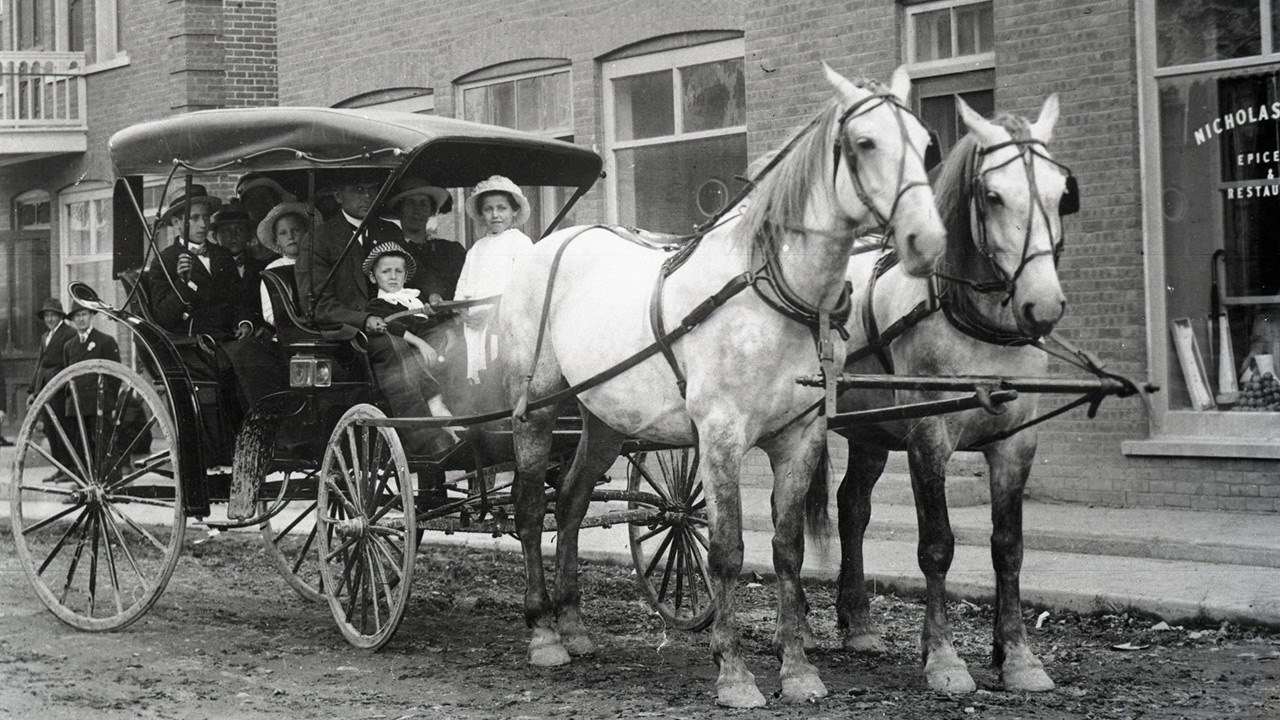 Sur la 2e photo, la famille de Napoléon Baillargeon et de Georgianna Vachon en voiture à chevaux sur la 1re avenue vers 1920. Quelle image extraordinaire, probablement par un beau dimanche ensoleillé. Il semble y avoir six enfants à bord, admirez leurs superbes chapeaux de paille, ils devaient avoir bien du plaisir à faire le trajet aller-retour. Cette famille habitait dans le rang Saint-Thomas (actuelle route 271) à Saint-Benoit Lâbre. Leur résidence est devenue le Foyer Baillargeon. La photo a été prise devant le restaurant-épicerie de Nicholas Tawel, sur la 1re avenue, à droite de l'actuelle Banque de Montréal, à peu près en face de la 120e rue.