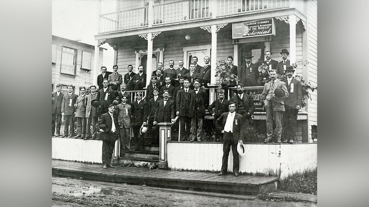 On pourrait presque les considérer comme des frères siamois, tellement ces deux centres sont liés. Beaucoup de géorgiens possèdent des chalets ou résidences aux magnifiques lacs de Saint-Benoit et de nombreux «saint-bens» viennent régulièrement à Saint-Georges soit pour y travailler, par affaire, pour magasinage et bien d'autres raisons. Ce n'est pas d'hier que les relations sont si serrées entre les deux. Voici trois photos de gens de Saint-Benoit prises sur la 1re avenue à Saint-Georges il y a bien longtemps. La 1re nous montre qu'aussi loin qu'en 1902, les invités (dont plusieurs de Saint-Benoit) à un mariage célébré à Saint-Georges (vu que la mariée était une géorgienne) sont ensuite allés se faire photographier devant le studio (et résidence) du renommé J. A. Gagnon, photographe. C'était la noce de Godfroid Bourque et Joséphine Pépin qui sont les deux premiers à gauche en avant. À côté d'eux, Gédéon Bourque et Alvine Pépin. En arrière, leurs invités, le 30 juin 1902. L'édifice du photographe Gagnon existe encore (maintenant un bloc à appartements), en face de Chaussures Cameron.