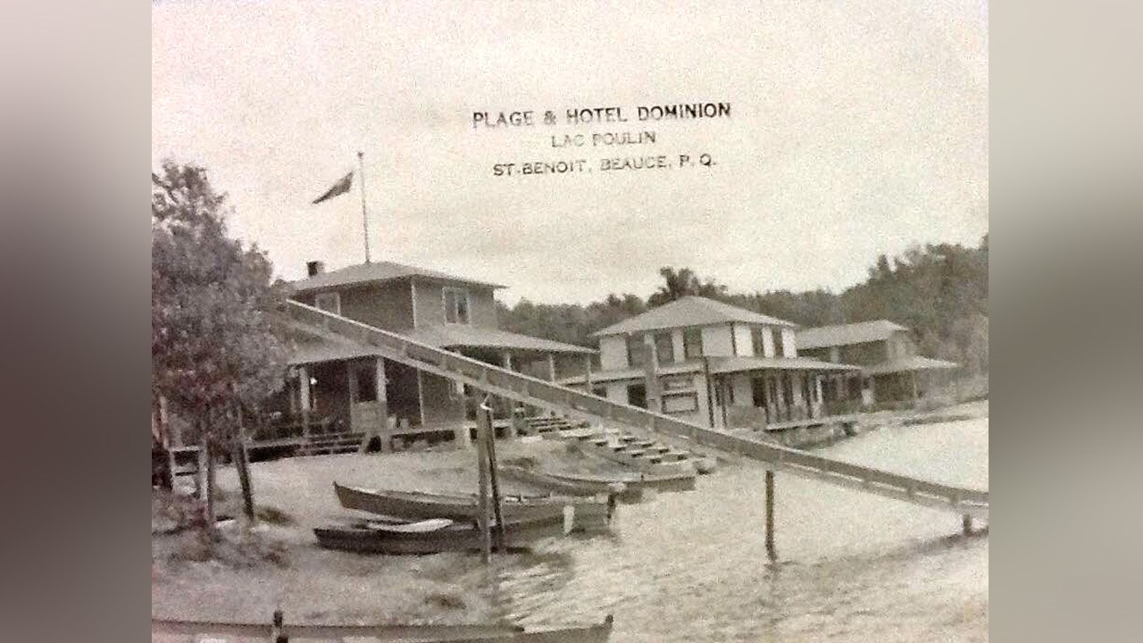 Et la 3e photo nous présente un groupe d'hommes non-identifiés de Saint-Benoit, sauf le premier à l'extrême gauche qui est M. Alphonse Labbé, fils de Moïse Labbé et de Philomène Roy. Alphonse était marié à dame Alphonsine Lessard. Il est décédé bien jeune, le 30 août 1911, à l'âge de 28 ans. Probablement un rassemblement d'un groupe genre Société Saint-Jean-Baptiste, Chevaliers de Colomb ou autre. Cliché pris devant la pharmacie St. Georges (ainsi écrit sur la pancarte) qui appartenait au Dr Michaud vers 1910. Édifice qui fut hélas incendié lors du grand feu de 1915. Cette bâtisse était située où se trouva par la suite le magasin 5-10-15 de M. Octave Papillon. Il fut incendié à son tour en 1987, aujourd'hui, c'est un stationnement face au Resto-Bar le Rock Café sur la 1re avenue. Pour démontrer que ces échanges sont réciproques, voici la 4e photo, de l'hôtel et de la plage Dominion il y a fort longtemps au lac Poulin de Saint-Benoit. Peu de gens encore vivants peuvent se targuer d'avoir connu l'hôtel Dominion, mais la plupart connaissent les lieux, puisque cette propriété est l'ancêtre de la fameuse Plage Maheux. C'est M. Elzéar Maheux qui a acheté cet établissement dont le nom a été plus tard changé pour «Plage Maheux», doublé d'un restaurant, un endroit très fréquenté par les gens de Saint-Georges. Wow, des souvenirs empreints de nostalgie, sûrement bien des descendants parmi les lecteurs.