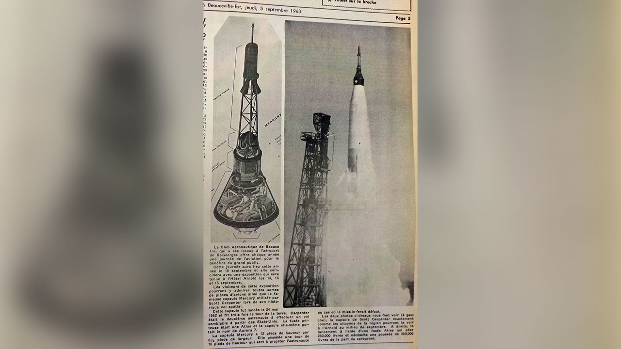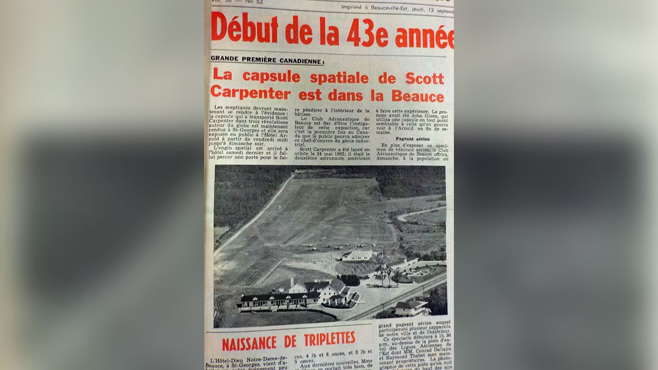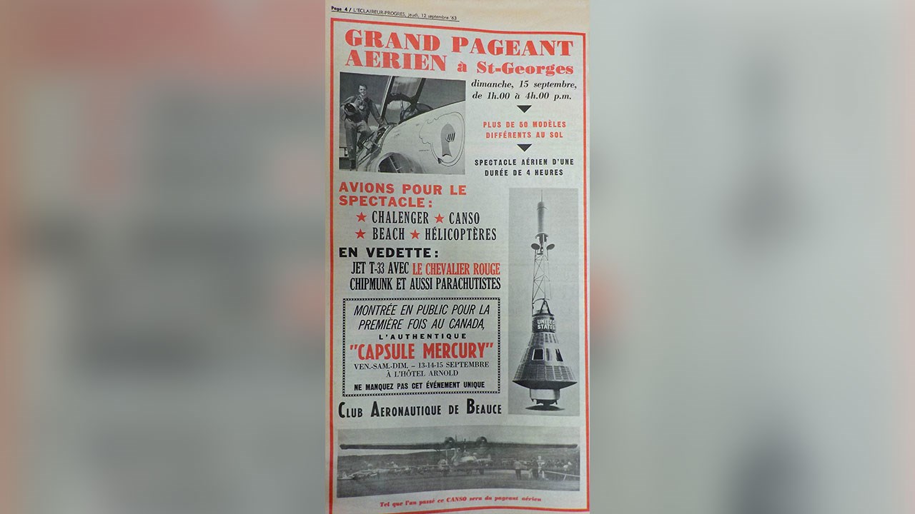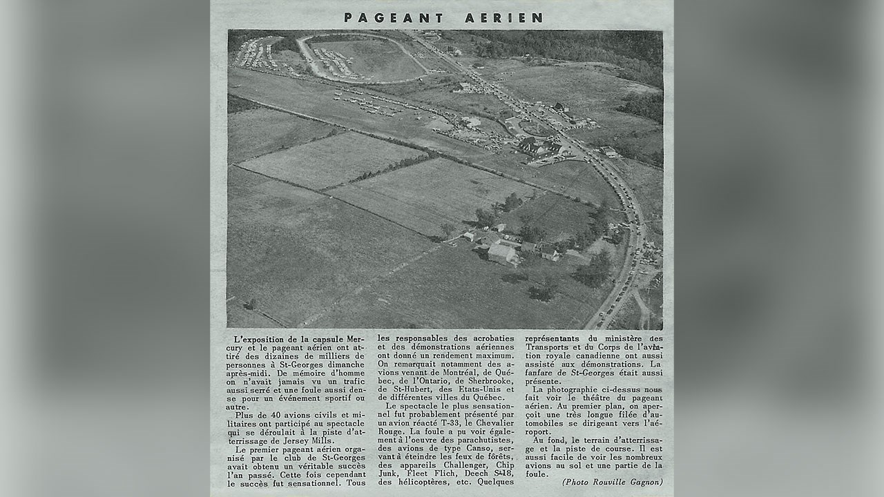 Quand a eu lieu l'embouteillage le plus grand de l'histoire de Saint-Georges? Il n'existe pas de statistique officielle à ce sujet dans notre ville. Mais si on devait en relever un des pires, ce serait sûrement celui survenu en début d'après-midi dans la journée du dimanche 15 septembre 1963, dans le secteur de Jersey-Mills, comme on le constate en partie à la première photo. Il semble que la congestion sur le boulevard Lacroix débutait aux environs de l'église l'Assomption et se rendait jusque dans le secteur du motel Kennedy, passé l'Arnold! En fait, ce n'est qu'une vue partielle, car l'énorme bouchon se poursuivait même au-delà, comme on le voit à la 2e photo, qui nous montre la suite du trafic. Sans compter les centaines d'automobiles stationnées plus loin, à côté et sur la piste de course adjacente à l'aéroport. Quel événement exceptionnel a pu provoquer un tel achalandage? C'est le pageant aérien présenté à la piste d'atterrissage des Lignes Aériennes de l'Est (LAE) située à l'arrière de l'hôtel Arnold à Jersey-Mills la fin de semaine des 13, 14 et 15 septembre 1963 (photo 2). Et surtout l'exposition de la capsule spatiale Mercury qui a transporté l'astronaute Scott Carpenter dans trois révolutions autour de la terre. C'était la première fois que ce véhicule spatial était exposé au Canada. Carpenter a été lancé en orbite le 24 mai 1962. Il était le deuxième astronaute américain à vivre une telle expérience, après son confrère John Gleen. Ce fut un exploit extraordinaire pour les organisateurs de ce spectacle grandiose de réussir à faire venir à Saint-Georges cet engin spatial seulement 16 mois après la réalisation de son voyage orbital dans l'espace. Autre attrait de cet événement, plus de 40 avions civils et militaires ont participé au spectacle, réalisant des acrobaties et donnant des démonstrations de leur savoir-faire. On aperçoit d'ailleurs les nombreux appareils stationnés sur le terrain de l'aéroport, à la 3e photo. Les principaux responsables de cette grandiose fiesta étaient MM Raymond Thabet et Conrad Dallaire, propriétaires des LAE. Quand à la capsule Mercury, on en apprend la description à la 4e photo, provenant d'un article paru dans le journal local du jeudi 5 septembre de la même année. Elle mesurait 12 pieds de haut et 6½ pieds de diamètre. Autre publicité de cette grande première canadienne parue dans le journal l'Éclaireur-Progrès du jeudi 12 septembre 1963, à la 5e photo. Wow, ce fut sûrement l'un des plus importants embouteillages de l'histoire de notre ville. Les beaucerons ont toujours été férus de ces pageants aériens qui sont encore présentés de temps à autre dans notre région, celui-là fut certes l'un des plus courus.