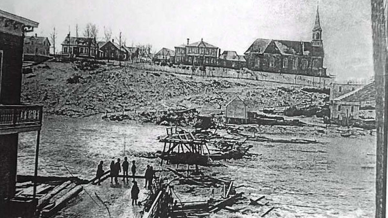 La plupart savent qu'on a eu un pont de bois pendant 30 ans au-dessus de la rivière au centre-ville au tournant des années 1900, mais certains seront peut-être surpris d'apprendre que ce pont fut déjà emporté par les glaces. Construit en 1881, il était à l'origine un pont couvert. Au début, le vent très fort qui soufflait arrachait continuellement les planches le recouvrant. Après une couple d'années, son propriétaire David Roy s'est lassé de les remettre et a choisi de ne laisser que la structure sans autre recouvrement (comme on le voit à la 1re photo). Cela régla ce problème, mais ce beau pont de bois devait affronter à chaque année un autre adversaire, encore plus redoutable: la débâcle printanière. Celle de 1896 fut particulièrement violente, la pire de notre histoire. Le pont de bois fut arraché. Mais d'abord, examinons la 1re photo, nous montrant les lieux vers 1907 alors que le pont était en place, pour que les lecteurs puissent constater à quel endroit précis aboutissait ce fameux pont du côté Est. Puis le 2e photo (de 1896), où on voit le côté Ouest au pire moment de la débâcle, alors que les glaces sont à leur plus haut niveau et que le pont est disparu; la descente pour aller au pont passait juste à côté de la bâtisse carrée blanche à deux étages sur la rive ouest (elle avait en réalité quatre étages, mais les deux niveaux inférieurs sont immergés sous les glaces). Puis d'autres photos d'époque prises en 1896 nous montrant de quoi avait l'air le panorama dans l'Est sans l'image habituelle du pont. La photo 3 nous offre une vue d'ensemble sur toute la ville de l'Est dans les jours suivants la destruction du pont de David Roy. On y voit sur la rive de l'ouest, en avant-plan, des gens regardant, impuissants, la rivière encore gonflée au lendemain de cette catastrophe, se demandant probablement comment ils allaient désormais se rendre sur l'autre rive. Une situation désespérante, le pont n'étant plus là. La 4e photo nous fait voir une scène moins étendue des mêmes lieux. On peut y reconnaitre l'endroit exact où passait le pont de David Roy avant sa destruction, même site où il fut reconstruit l'année suivante. Le pont arrivait à droite de la grosse maison blanche à 4 lucarnes (qui appartenait au marchand Ephrem Poulin). Il aboutissait entre cette bâtisse et la maison carrée à sa droite, celle au toit plat, qui appartenait au propriétaire de pont David Roy (elle existe encore, appartenant au notaire Benoit Maheux) et où les utilisateurs du pont devaient payer le coût du passage à chaque fois: une cenne pour les piétons et 3 pour les voitures à cheval. Dans les jours suivant, le niveau de la rivière diminua considérablement, pour retrouver sa taille normale; on pouvait alors apercevoir les ruines de ce qui restait du pont (photo 5). Les géorgiens durent se passer de pont pendant tout le reste de l'année 1896 et une partie de l'année 1897. Une période de plus d'un an sans pont, les gens devant utiliser des chaloupes en été et traverser sur la glace en hiver. Malgré ces calamités, le pont fut reconstruit, les gens ont réparé les dégâts causés aux bâtiments de la 1re avenue et la vie a repris son cours normal. C'est la seule fois où ce pont de bois fut emporté par la débâcle. Incroyable que nos ancêtres aient dû endurer ces crues printanières à répétition avec tous les inconvénients que cela engendre, sans oublier qu'à l'époque, les sinistrés ne recevaient aucune aide gouvernementale. Heureusement, avec le pont en acier et béton actuel, il y a peu de risque qu'une telle catastrophe ne se reproduise un jour. Merci à tous les concitoyens qui ont conservé ces photos extraordinaires, qui ont abouti à la Société Historique Sartigan, c'est grâce à eux que nous pouvons aujourd'hui visualiser ces événements marquants de notre histoire.