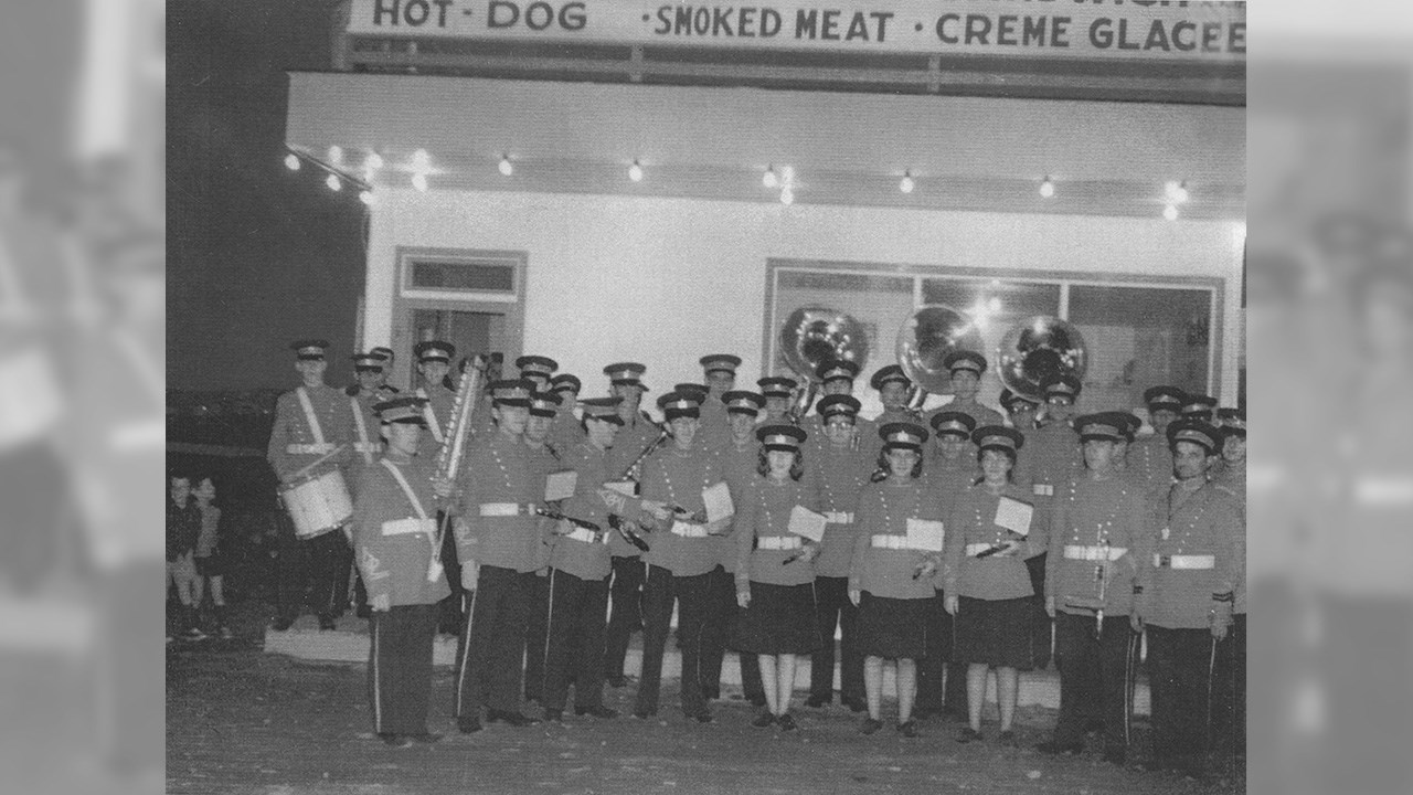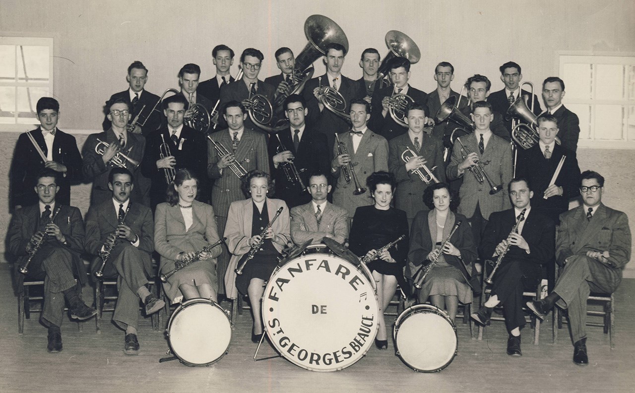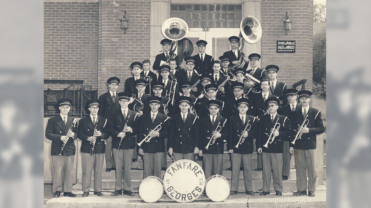 Suite à l’histoire de notre fanfare publiée dernièrement, voici quelques autres photos intéressantes. Notre fanfare offrait de superbes prestations en une foule d’occasions pour animer et égayer toutes sortes de festivités locales. D’abord dans la plupart des défilés et parades qui avaient lieu plus souvent qu’aujourd’hui dans les rues de notre ville. La première en est une autre montrant un spectacle présenté en juillet 1955 juste en face de l’église de l’ouest. Leurs costumes rouges étaient magnifiques. Mais étant confectionnés de laine, ils étaient terriblement chauds lors des démonstrations extérieures pendant la période estivales. C’était acceptable pour l’automne (photos 2 et 3 du 29 octobre 1960) mais difficilement supportable lors des parades estivales dans les rues, comme on le voit aux photos 4 et 5, prises en 1947. Sur la 6e photo, on les voit devant le restaurant Luncheonnette de la 2e avenue vers 1964, probablement prise à l’occasion de la démonstration offerte au moment où ils ont étrenné leur beaux costumes provenant du commerce voisin de ce restaurant, la Mercerie Sévigny. Ils ont aussi donné régulièrement des spectacles en plein air à l’ancien kiosque du Parc Bélair dans les décennies ‘50 et ‘60 (photo 7). Ils ont même offert une prestation lors d’une assemblée créditiste des Bérets Blancs probablement au début des années ‘50 (photo 8). Une autre photo nous les montre lors du spectacle présenté le 27 mai 1967 au cours de l’Expo ‘67 à Montréal (photo 9). La 10e photo semble aussi avoir été prise sur les terrains de l’Expo ‘67. Évidemment, le succès en ce domaine implique des pratiques fréquentes pour que tous les membres soient bien coordonnés et à l’aise de jouer tous ensemble en suivant les instructions du directeur. La 11e photo, de 1948, semble avoir été prise à l’occasion d’une pratique; wow, c’était il y a plus de 70 ans, c’est émouvant de voir tous ces géorgiens et géorgiennes réunis pour partager un si beau passe-temps. Une autre photo de groupe nous les montre encore tous ensemble devant l’ancien centre social des Chevaliers de Colomb en 1954, probablement dans les instants précédant un spectacle dans la grande salle (photo 12). Cet édifice fut démoli en 1988 pour y aménager un stationnement, il était situé en face d’où se trouve aujourd’hui le commerce Huguette Fleuriste.