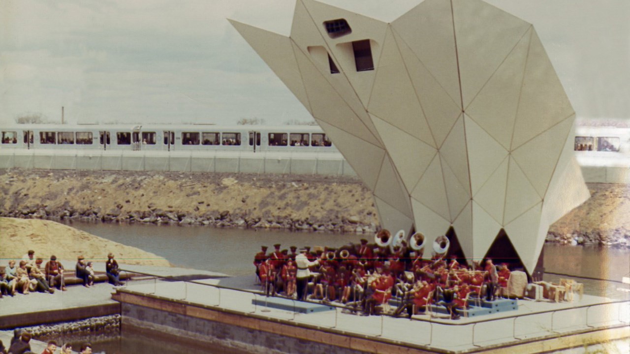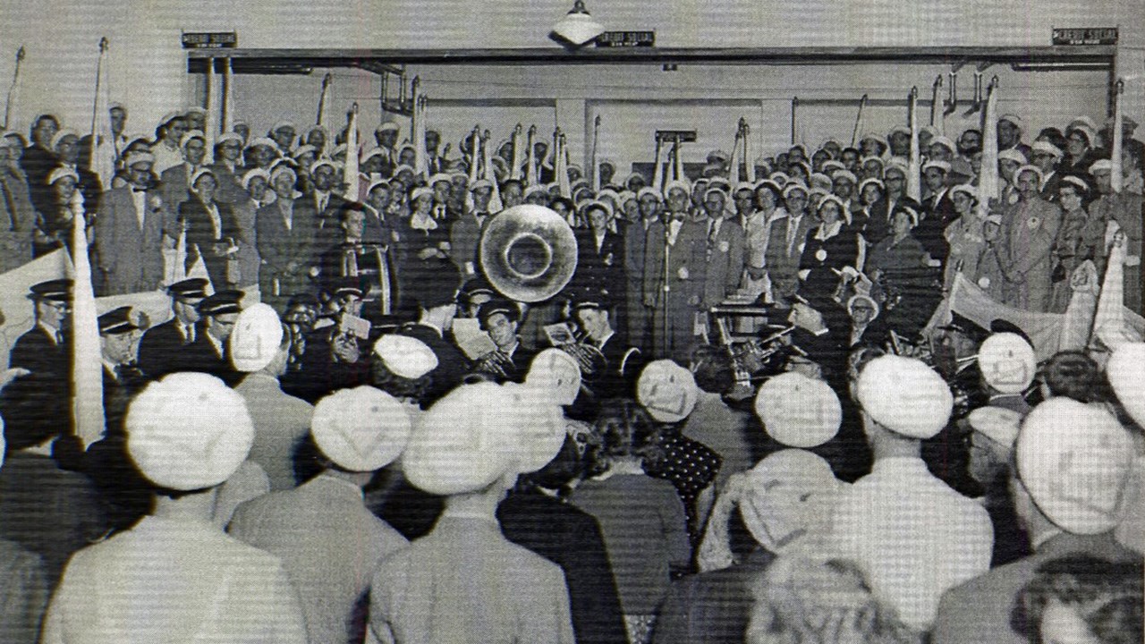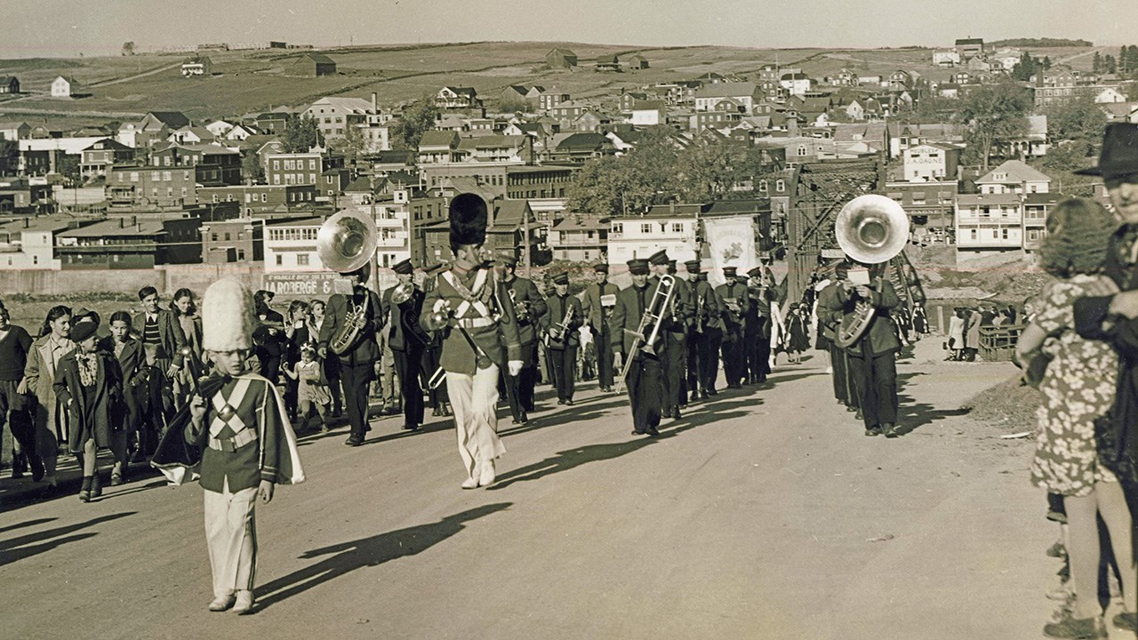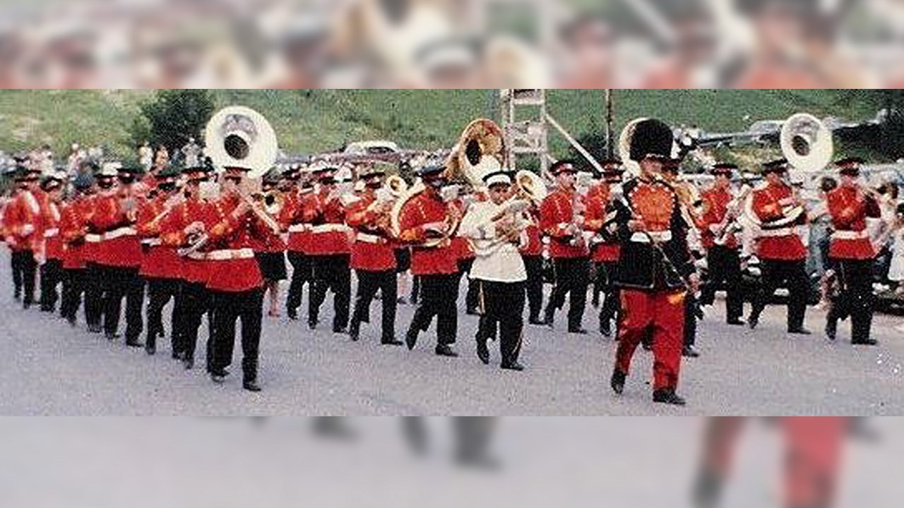 Suite à l’histoire de notre fanfare publiée dernièrement, voici quelques autres photos intéressantes. Notre fanfare offrait de superbes prestations en une foule d’occasions pour animer et égayer toutes sortes de festivités locales. D’abord dans la plupart des défilés et parades qui avaient lieu plus souvent qu’aujourd’hui dans les rues de notre ville. La première en est une autre montrant un spectacle présenté en juillet 1955 juste en face de l’église de l’ouest. Leurs costumes rouges étaient magnifiques. Mais étant confectionnés de laine, ils étaient terriblement chauds lors des démonstrations extérieures pendant la période estivales. C’était acceptable pour l’automne (photos 2 et 3 du 29 octobre 1960) mais difficilement supportable lors des parades estivales dans les rues, comme on le voit aux photos 4 et 5, prises en 1947. Sur la 6e photo, on les voit devant le restaurant Luncheonnette de la 2e avenue vers 1964, probablement prise à l’occasion de la démonstration offerte au moment où ils ont étrenné leur beaux costumes provenant du commerce voisin de ce restaurant, la Mercerie Sévigny. Ils ont aussi donné régulièrement des spectacles en plein air à l’ancien kiosque du Parc Bélair dans les décennies ‘50 et ‘60 (photo 7). Ils ont même offert une prestation lors d’une assemblée créditiste des Bérets Blancs probablement au début des années ‘50 (photo 8). Une autre photo nous les montre lors du spectacle présenté le 27 mai 1967 au cours de l’Expo ‘67 à Montréal (photo 9). La 10e photo semble aussi avoir été prise sur les terrains de l’Expo ‘67. Évidemment, le succès en ce domaine implique des pratiques fréquentes pour que tous les membres soient bien coordonnés et à l’aise de jouer tous ensemble en suivant les instructions du directeur. La 11e photo, de 1948, semble avoir été prise à l’occasion d’une pratique; wow, c’était il y a plus de 70 ans, c’est émouvant de voir tous ces géorgiens et géorgiennes réunis pour partager un si beau passe-temps. Une autre photo de groupe nous les montre encore tous ensemble devant l’ancien centre social des Chevaliers de Colomb en 1954, probablement dans les instants précédant un spectacle dans la grande salle (photo 12). Cet édifice fut démoli en 1988 pour y aménager un stationnement, il était situé en face d’où se trouve aujourd’hui le commerce Huguette Fleuriste.