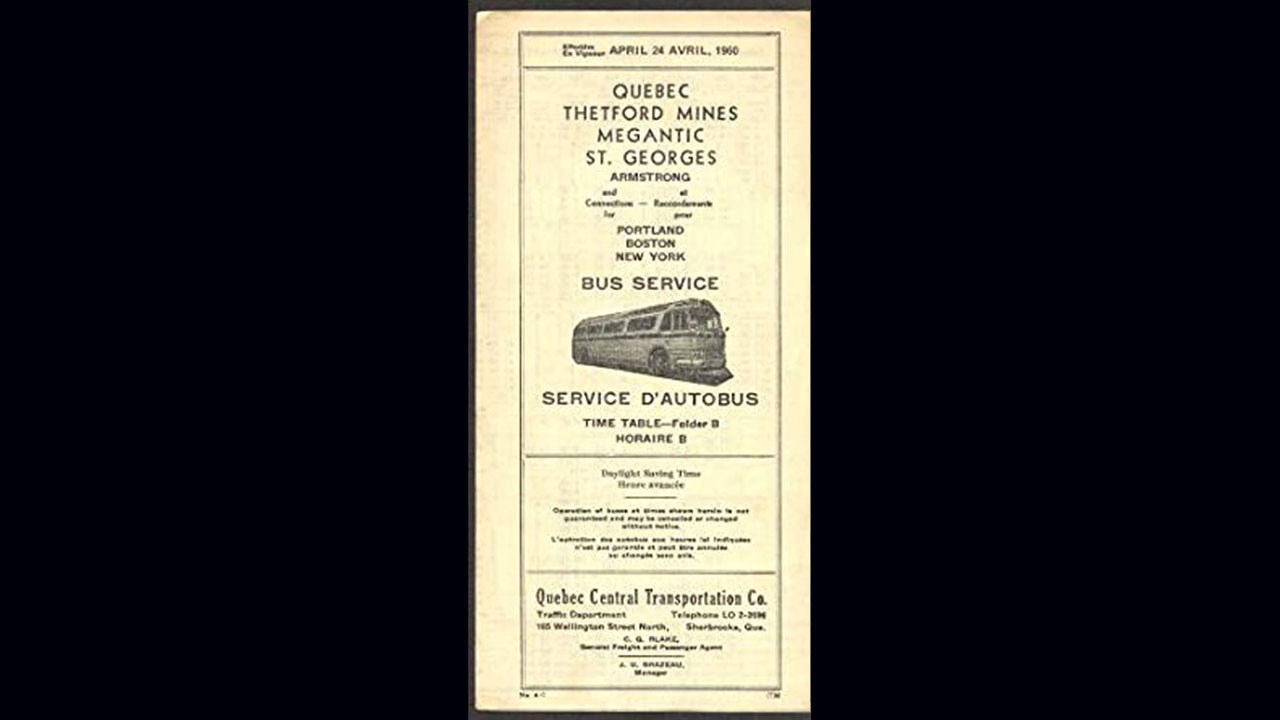 Les plus âgés se souviennent qu'il y eut autrefois à Saint-Georges un circuit d'autobus qui faisait le tour de la ville. Ce service a existé vers les années 1951 à 1955, époque où beaucoup de gens ne possédaient pas d'automobile, comparé à la situation actuelle. C'est l'ancien maire Sylvester Redmond qui fut le premier à exploiter une telle entreprise. En revenant de son service militaire en 1945, M. Redmond avait obtenu l'autorisation du gouvernement d'importer des autobus de Boston pour le transport dans notre ville. Il fonde ensuite la compagnie Autobus Redmond dont les garages et le terminus étaient alors situés sur un grand terrain derrière sa résidence (qui était en arrière de l'actuelle Banque Nationale, comme on le voit à la 2e photo). Il y avait un autobus partant du terminus Redmond qui faisait le circuit dans toute la ville, incluant la Station, le centre-ville des deux côtés (Est et Ouest) passant à l'hôpital, puis revenant dans l'Est pour longer la rivière vers Jersey-Mills, retourne chez Wilfrid Paquet, descend sur la 2e avenue et recommence ensuite la ronde suivante, aux mêmes endroits. Il embarquait et débarquait des passagers un peu partout le long du trajet. La durée totale de ce circuit était d'environ une heure. Un billet coûtait .10 cent, trois pour .25c. Mais il y avait aussi un service offrant le transport pour l'OTJ au parc des 7-chutes sept jours par semaine, dont les départs étaient plus fréquents les fins de semaine, comme on le constate à un des billets alors utilisés (photo 3), au coût de 10 billets pour 1$. Il semble que le chauffeur poinçonnait le billet lors de chaque utilisation pour empêcher qu'on le réutilise. On remarque aussi que pour le retour, les enfants étaient ramenés à la salle paroissiale dans l'Ouest ou au terminus Redmond dans l'Est, pouvant ainsi transférer dans un autobus du circuit urbain. Et un autre billet pour le service de transport vers le lac Poulin et lac Raquette au coût de .40c pour un passage simple ou .75c pour un aller-retour (photo 4). Voici les noms de quelques uns de ses chauffeurs: Ben Gilbert, Benoit Jacob, Bertrand Grenier, Benoit Poulin, un M. Bolduc, Georges Letendre, Sylvester Redmond et son frère.  Vers 1955, celui-ci discontinua ce domaine car il réalisa que c'était plus rentable de commercer les autobus que le transport. C'est la compagnie Québec Central Transportation qui l'acheta. Celle-ci se consacrait plutôt au transport interurbain (de passagers et de colis) vers Québec, Montréal, villes intermédiaires et les États-Unis. À la 1re photo, on voit un de leurs autobus embarquant des passagers devant l'hôtel National en 1948. Une autre photo (la 5e) nous en montre un autre dans des moments plus difficiles, on voit le chauffeur installant les chaines sur les roues sur une route enneigée. Voyez un dépliant d'avril 1960 donnant l'horaire des transports de Québec, Thetford, Mégantic et Saint-Georges (photo 6). Dans les années '60, il y eut aussi la compagnie Autobus de Thibaudeau et frère (Gérard et Charles-Auguste) qui faisait le transport Saint-Georges-Lambton-Sherbrooke. Ils ont aussi acquis une autre entreprise faisant le transport Québec-Saint-Georges-Mégantic. Aujourd'hui la plus grosse entreprise de transport interurbain à Saint-Georges est Autobus Breton Inc faisant aussi affaire sous le nom d'Autocars La Chaudière Inc.