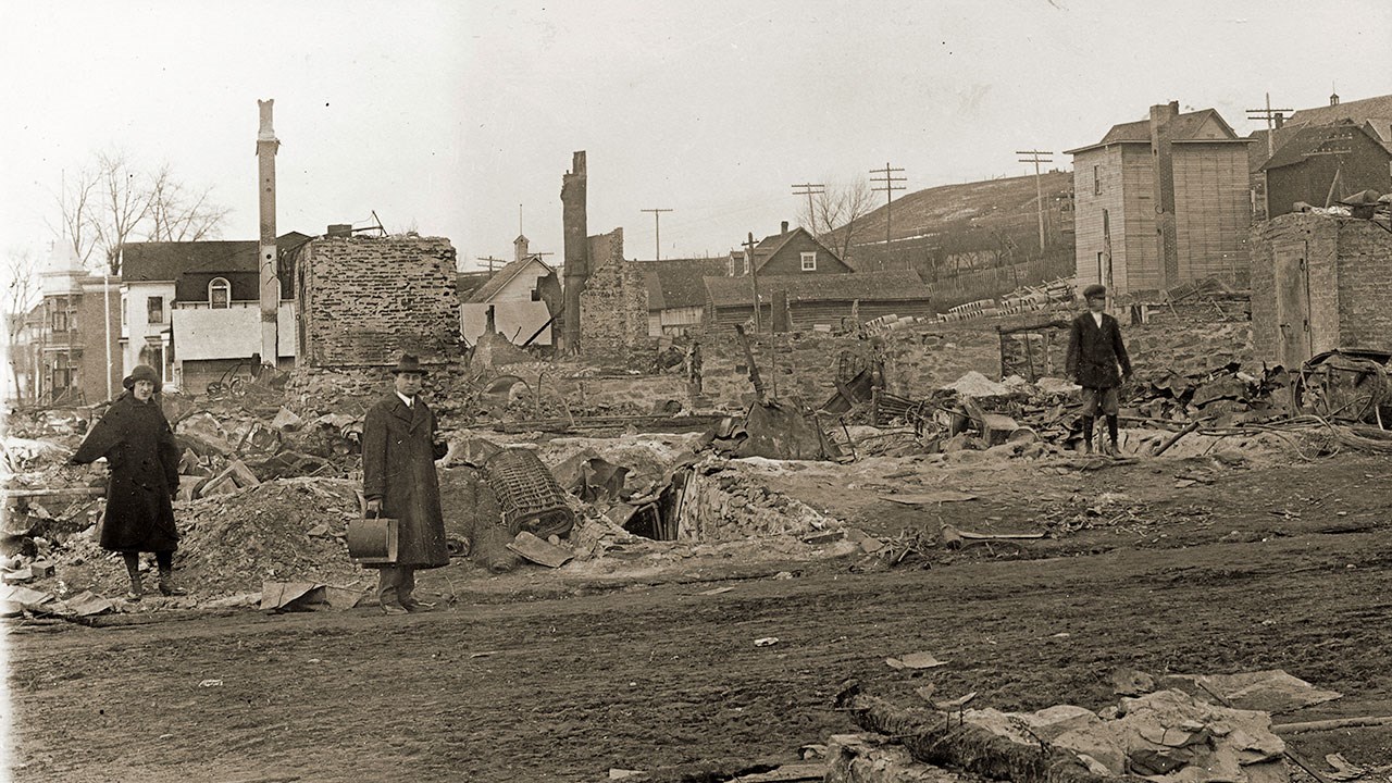 La plupart ont entendu parler du terrible incendie de 1915 à Saint-Georges. Cette conflagration historique a eu lieu exactement le 21 novembre 1915. L'étincelle a jailli à 3h30 du matin dans l'édifice en bois d'Arthur Rodrigue, en plein centre du village. Le barbier Veilleux et le photographe Alfred Poulin furent les premières victimes. L'incendie s'est propagée à la vitesse de l'éclair en raison d'un vent favorable et de la proximité des édifices. En moins de deux heures, les flammes ont couvert une superficie de cinq acres, détruisant toutes les bâtisses du centre ville dans le quadrilatère situé entre la 1re et la 2e avenue du côté est-ouest jusqu'aux immeubles situés à peu près entre où se trouve aujourd'hui le restaurant chez Francine et le côté sud de la 120e rue du côté nord-sud. C'était la désolation totale.