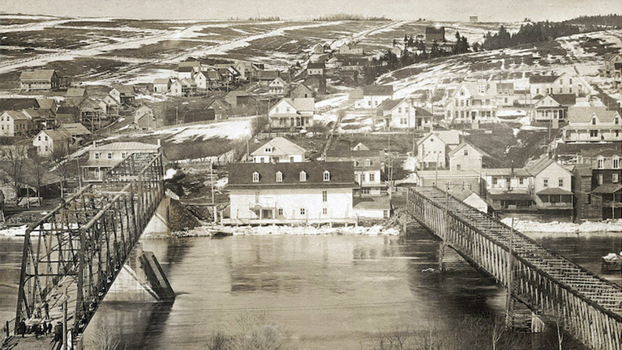 Autre expansion postérieure. Probablement que son immeuble était rendu trop petit pour loger toute sa marchandise et pour pouvoir accueillir plus de clients, il érigea un autre immeuble de même style mais deux fois plus long de l'autre côté de la rue, juste en face du premier, vers 1895 (photo 3). Il y avait cinq lucarnes. Remarquez son enseigne EPHREM POULIN MARCHAND GÉNÉRAL. Son premier édifice est devenu sa résidence et il a déménagé son commerce dans sa nouvelle bâtisse beaucoup plus vaste. C'était un secteur achalandé et très populaire, la preuve en étant qu'on y a aménagé une arche lors d'une fête religieuse (photo 4). Autre décor de célébration festive à la photo 5. Aussi un achalandage impressionnant près de cet édifice à la même époque (photo 6). Un grand avantage qu'il avait était d'être tout juste à côté du pont de bois de David Roy, favorisant l'accès à son magasin pour tous ceux qui avaient affaire dans l'est. Voyez son imposant magasin situé entre les deux ponts lorsqu'on a ouvert le premier pont de fer en 1912, photo prise à partir de l'ouest (photo 7).